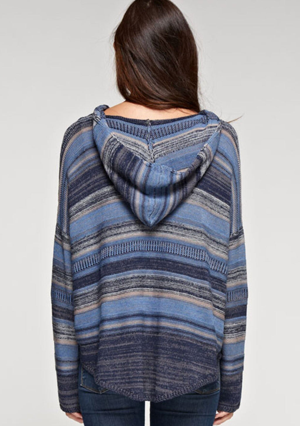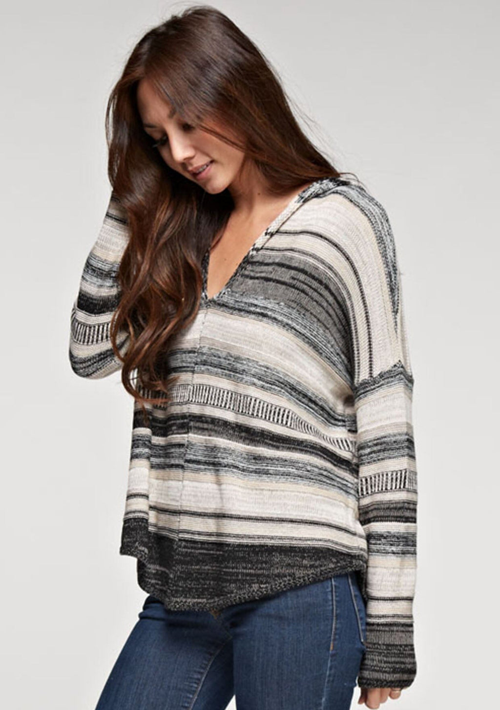 Super soft and effortlessly cozy, this striped knit sweater hoodie features long sleeves, a v-neckline, and a relaxed fit for a flattering silhouette. The perfect blend of boho chic and casual comfort, it’s a fall essential made for pairing with your favorite denim.