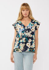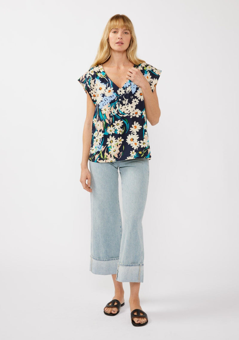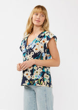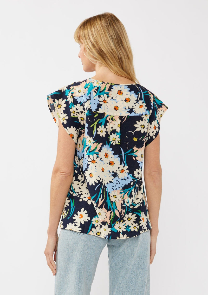 A daisy floral top that instantly brightens your look! This top showcases short cap sleeves, elegant pleated shoulder details, and a flattering v-neckline. The lively print brings a fresh pop of color, making it a refreshing addition to your wardrobe. Easily pairs with any trouser or denim for a versatile look.