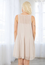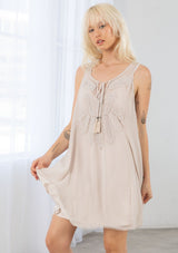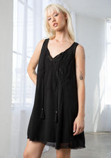 We're feeling oh-so-pretty in this sheer chiffon mini dress! A charming style with a delicate front applique detail, a raw unfinished hemline, and a split neckline with tassel ties. The whisper-thin sheer cotton chiffon keeps you cool on warm Summer days and nights.