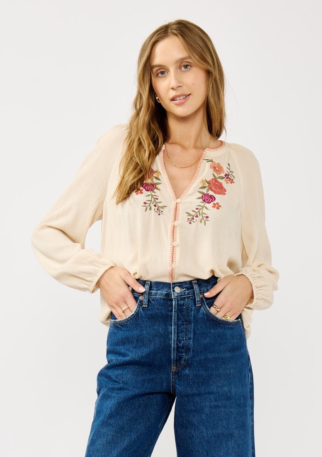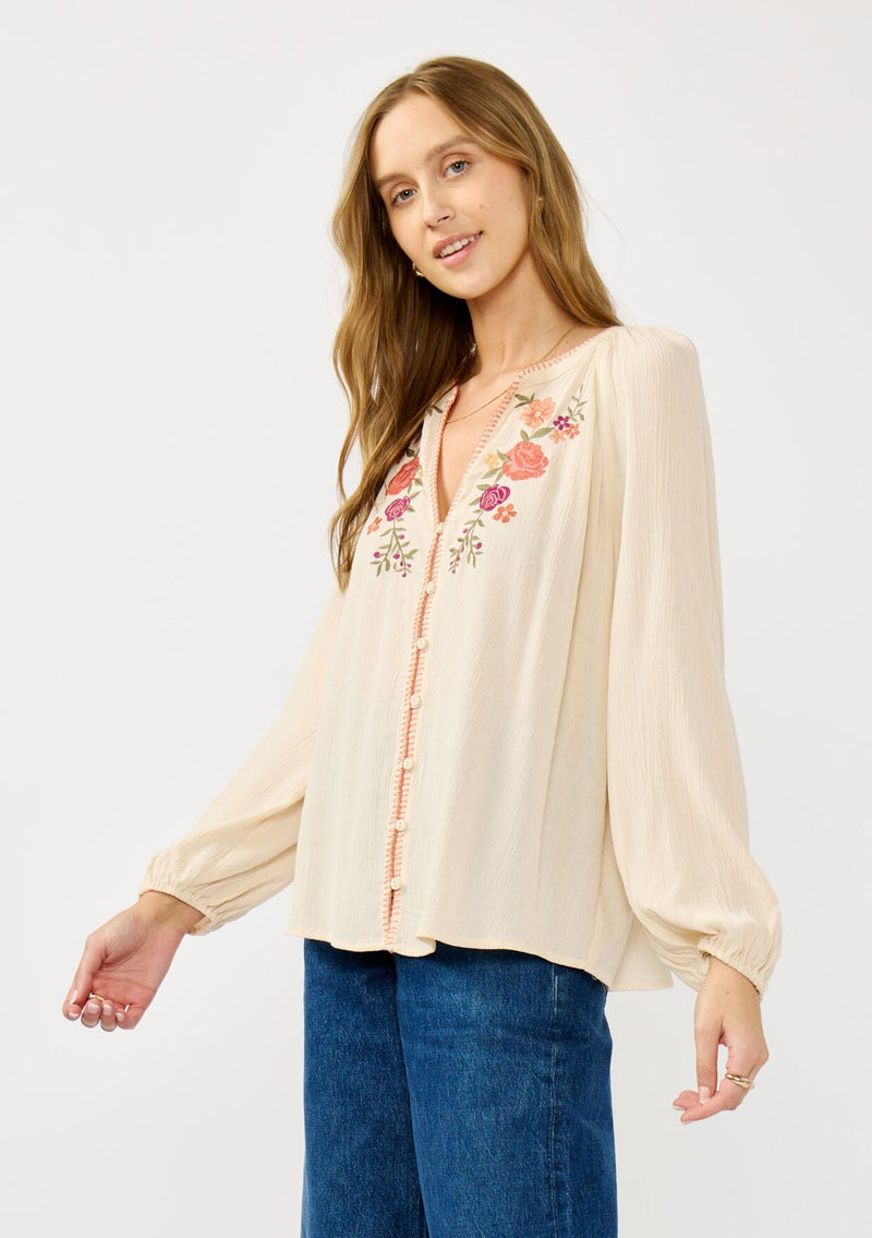A timeless piece with a boho twist, this breezy blouse stands out with intricate embroidery and an easy, flowy silhouette. Finished with a classic split v-neckline and button front, it’s effortlessly stylish for any special moment. Pair it with wide-leg pants for a laid-back look you'll come back to again and again.
