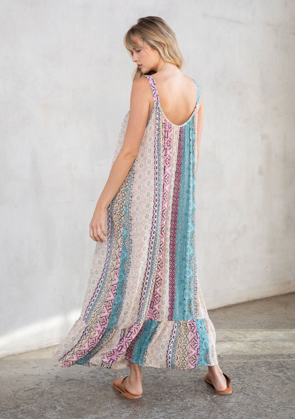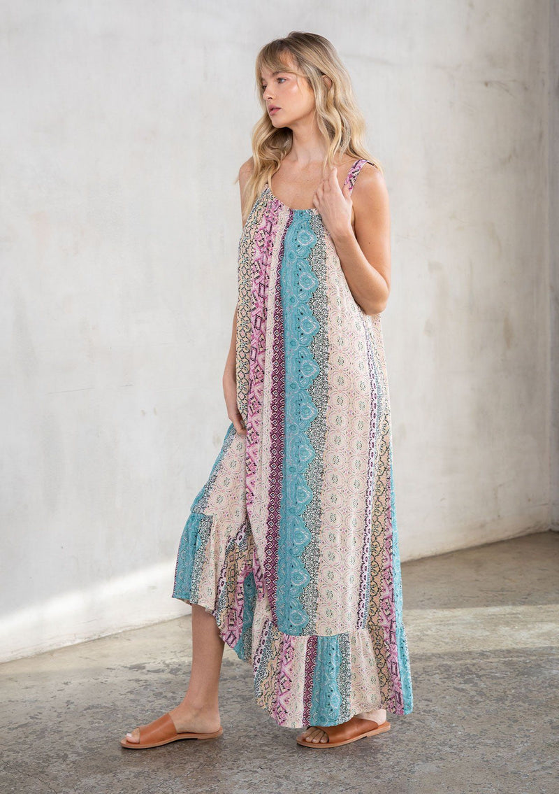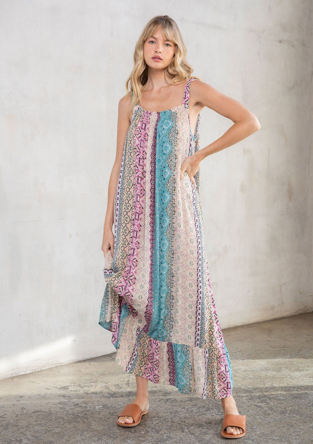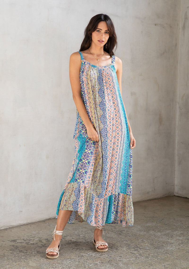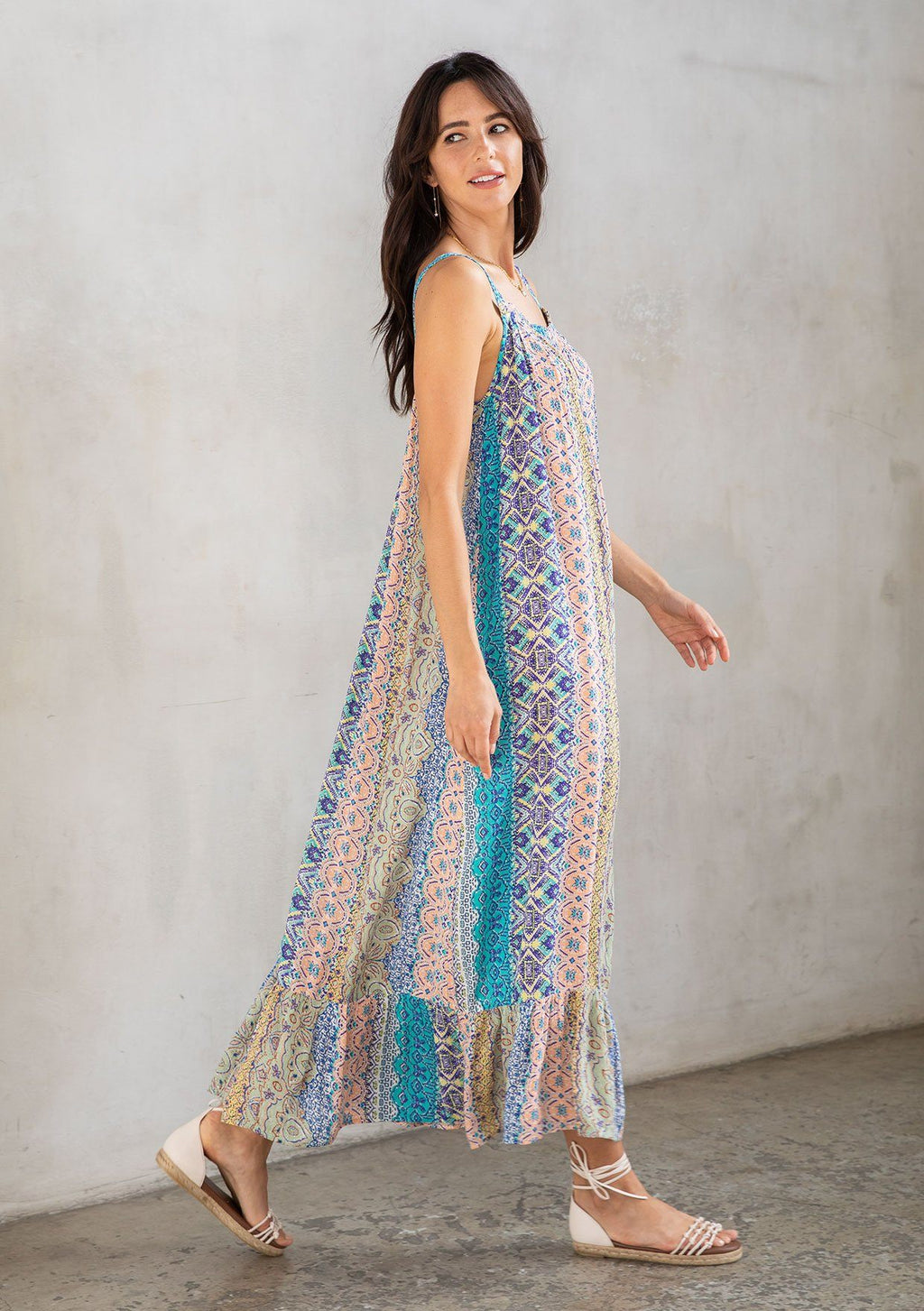 Shop NowA resort-ready maxi dress worthy of a vacation! Designed in an ultra-bohemian mixed print, this flowy sleeveless maxi dress features light-catching gold metallic thread details and a flirty ruffle-trimmed round neckline. Throw it on over your swimsuit at the beach, or dress it up with sandals for balmy late nights.