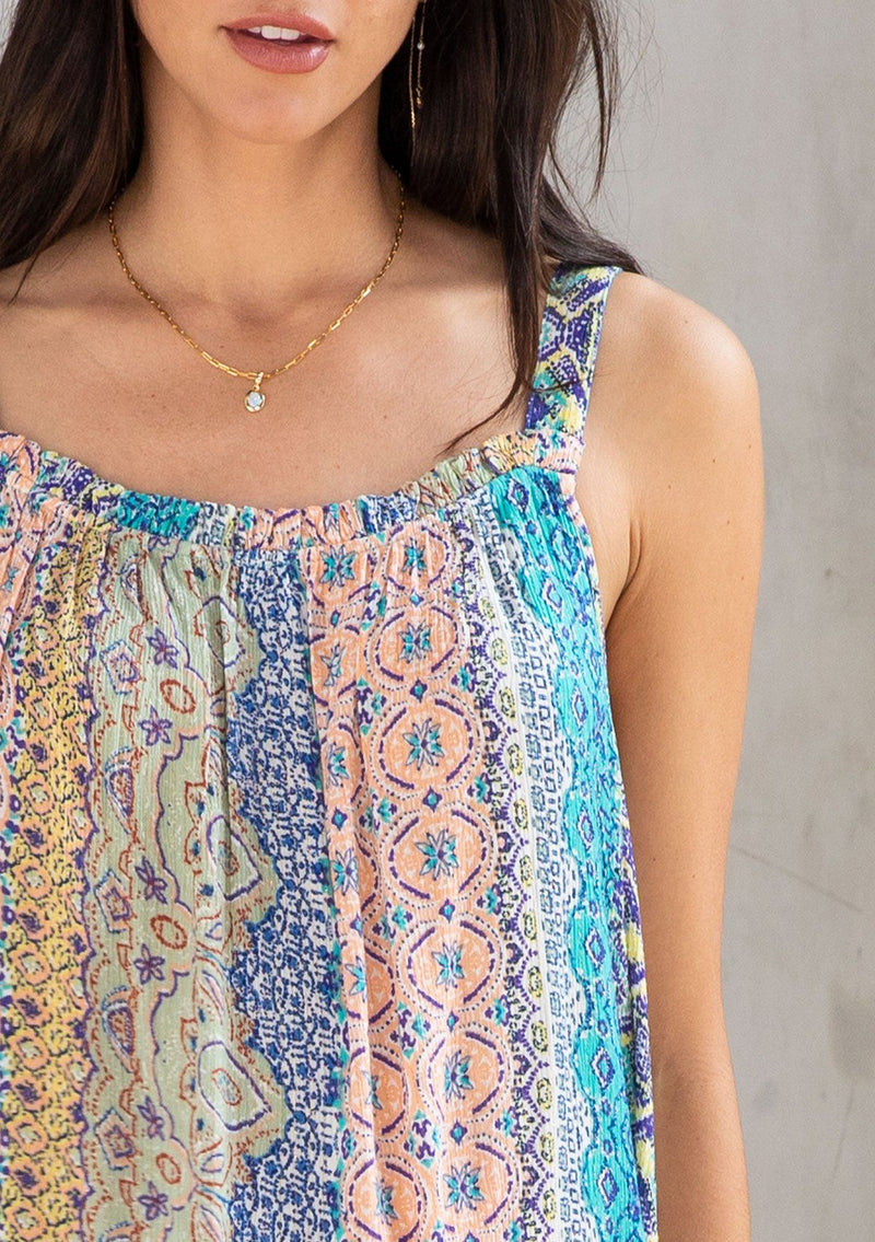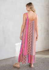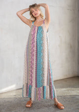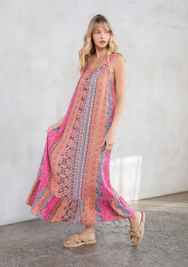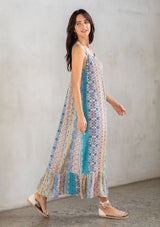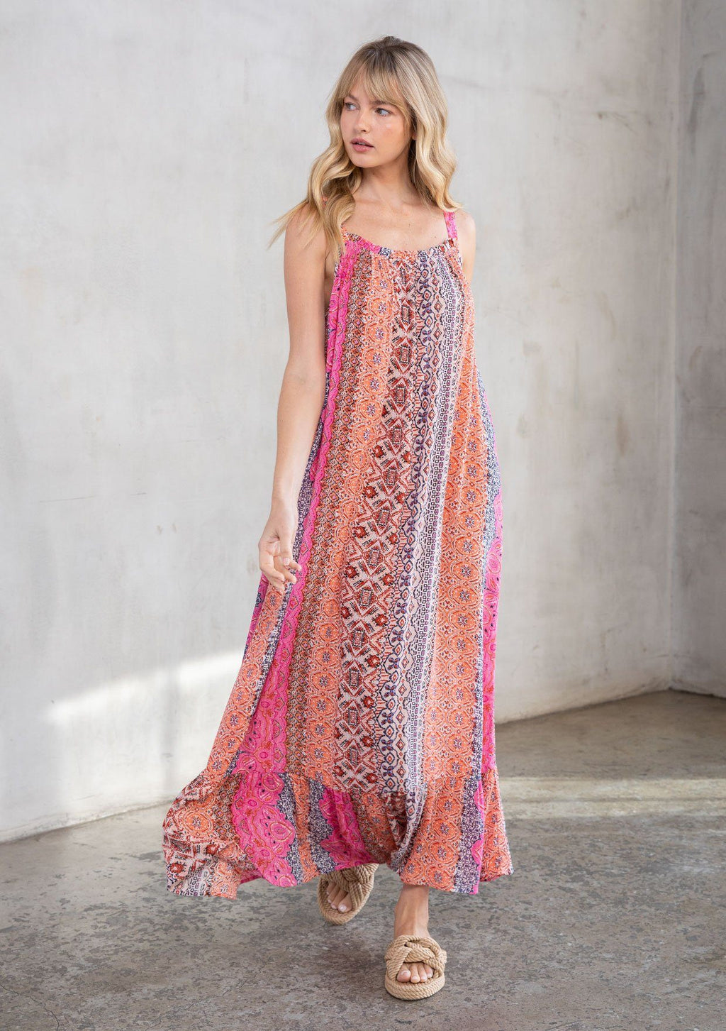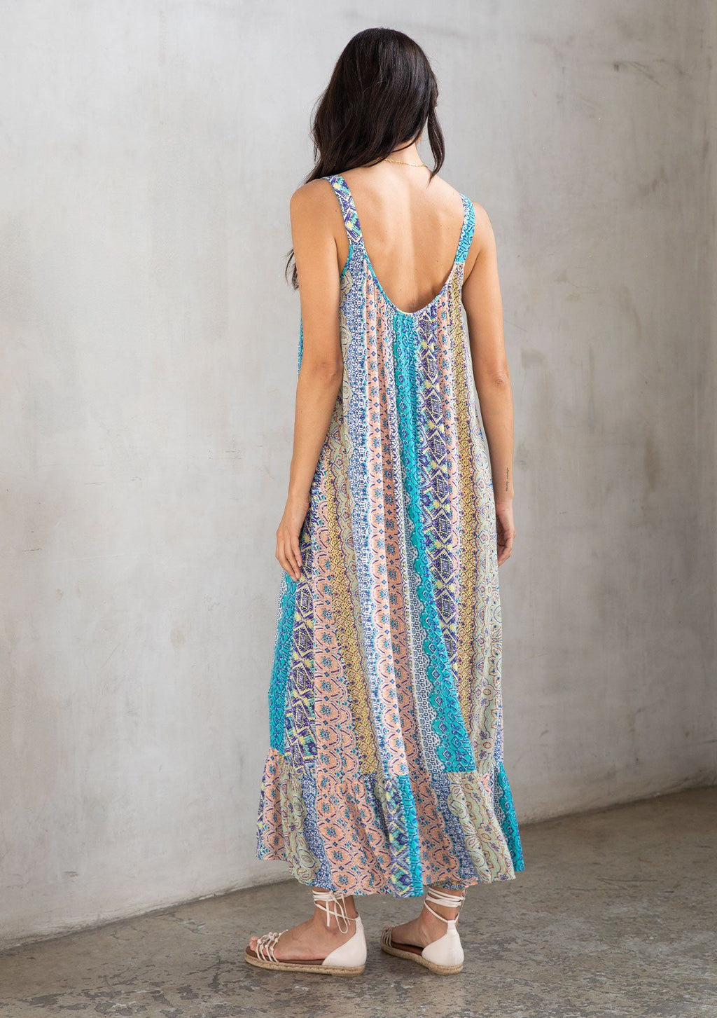 Shop NowA resort-ready maxi dress worthy of a vacation! Designed in an ultra-bohemian mixed print, this flowy sleeveless maxi dress features light-catching gold metallic thread details and a flirty ruffle-trimmed round neckline. Throw it on over your swimsuit at the beach, or dress it up with sandals for balmy late nights.