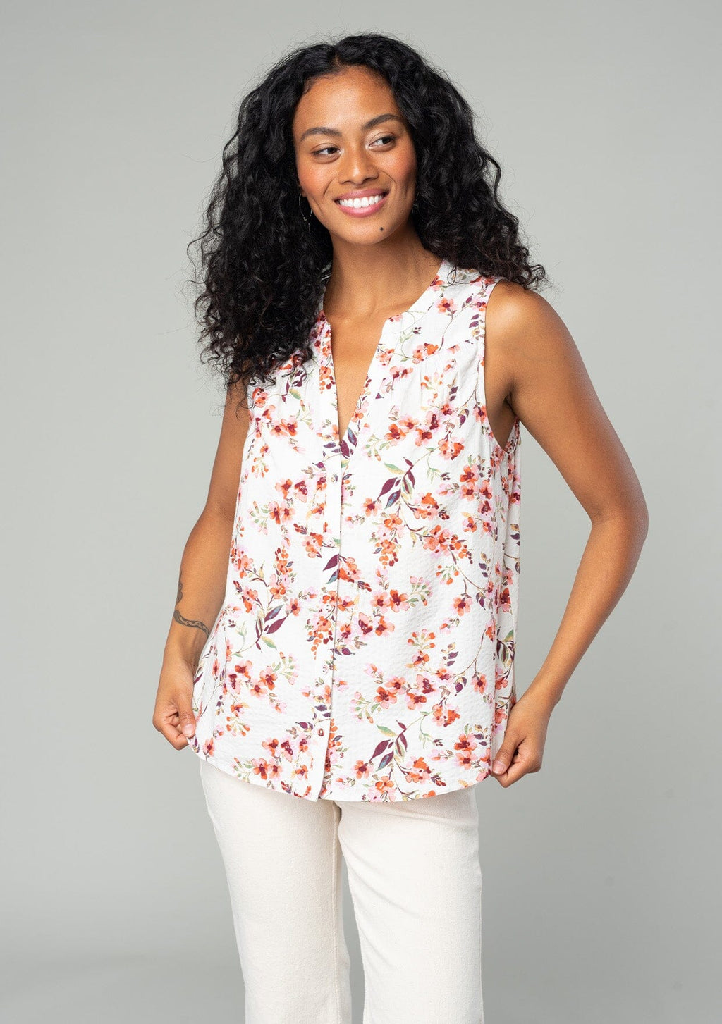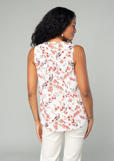 A classic sleeveless spring blouse in a natural and rose pink floral print.