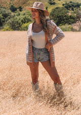 A unique speckled loop knit adds texture to this classic boho cardigan. With long sleeves, an open front, and essential side pockets. The soft neutral color pairs well with denim.