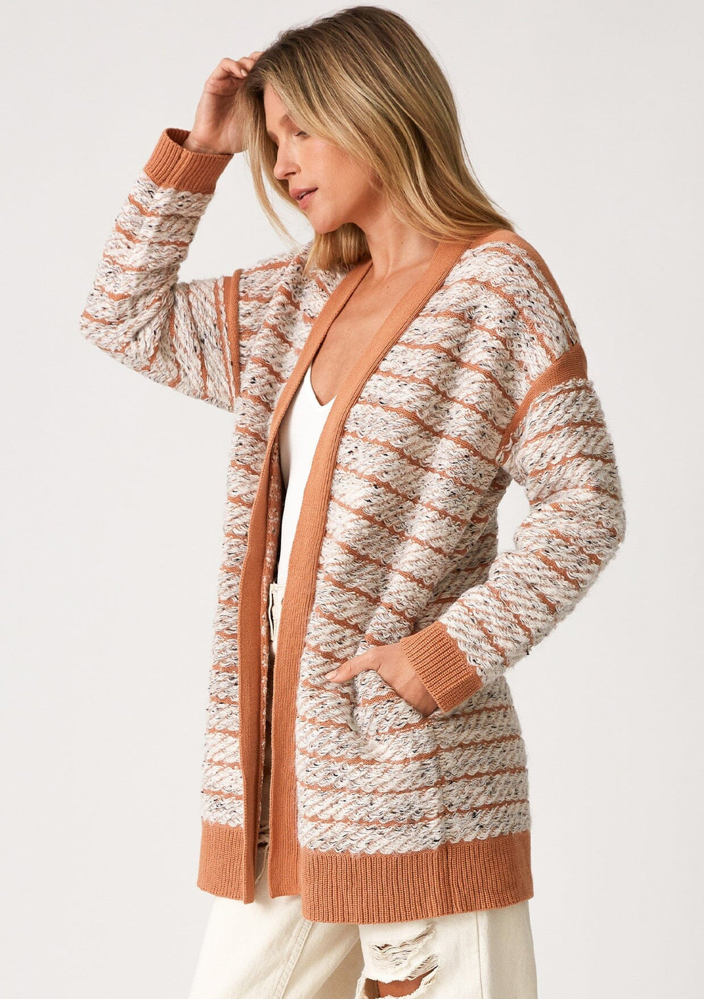 An ultra warm and cozy mid-length cardigan in a speckled loop stripe.