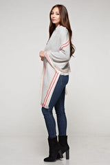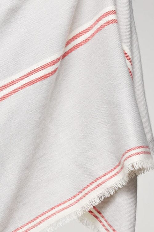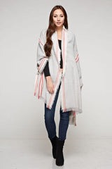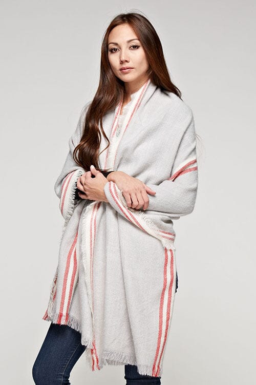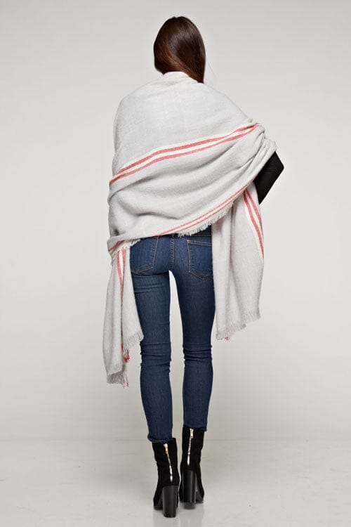 Oversized long scarf in grey and red, featuring a striped border design for a versatile, eye-catching accent. Perfect for accessorizing and elevating any casual look when you want effortless style with minimal effort.