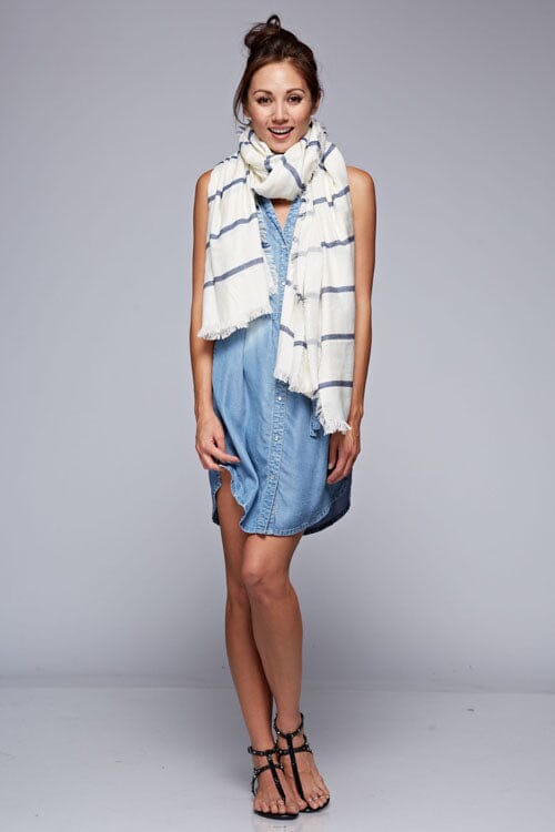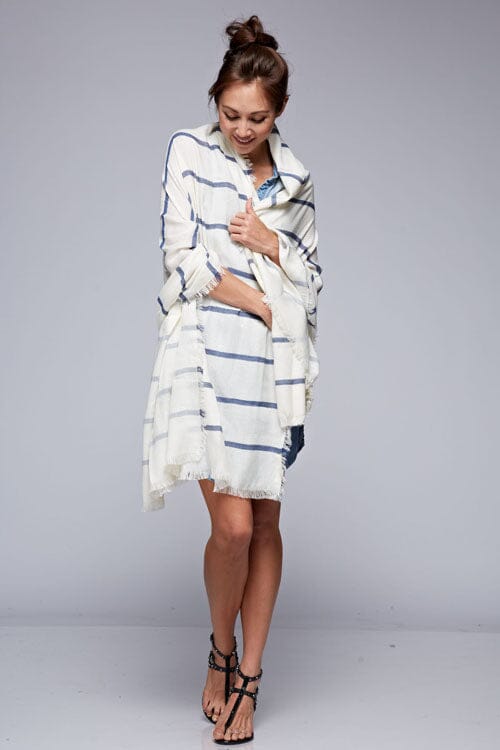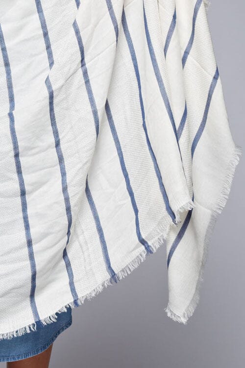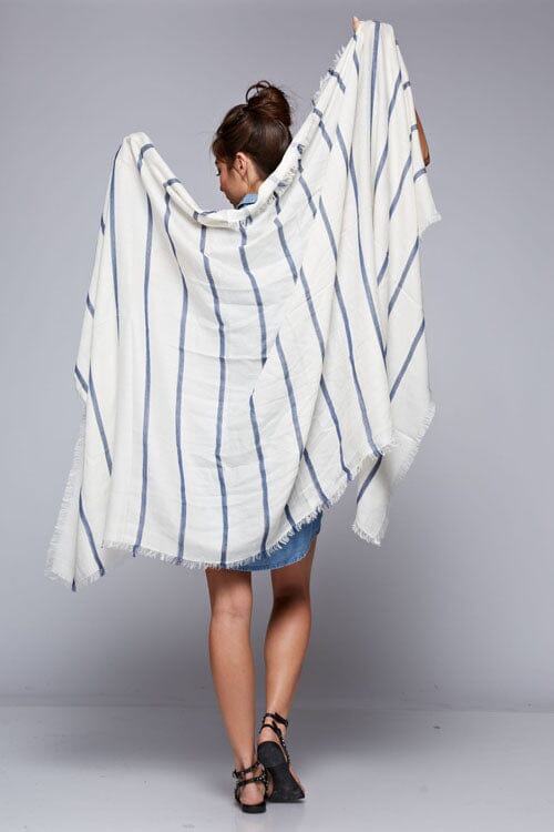 Shop NowOversized sheer scarf in blue and ivory, featuring a subtle thin striped design for a light, airy feel. Perfect for accessorizing and elevating any casual look when you want effortless style with minimal effort.