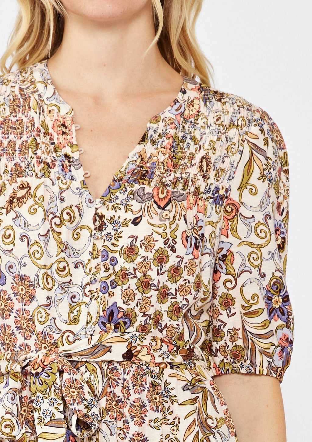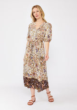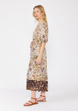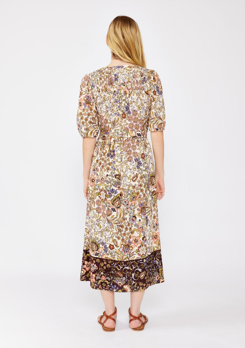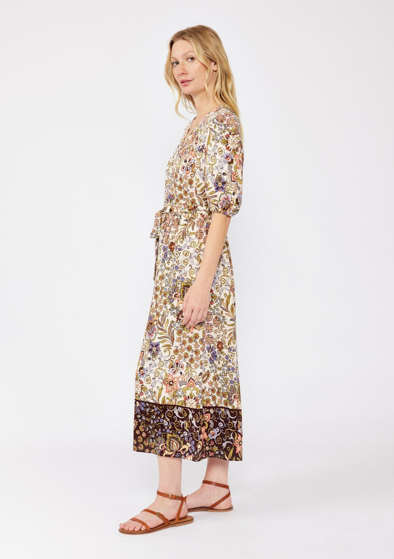Embrace the essence of autumn with this beautifully designed dress, featuring rich, earthy hues and a bohemian floral pattern. Ultra-relaxed and flowy, this dress features short puff sleeves, a self-covered button front, and a charming self-tie waist belt for a customizable fit. Perfectly suited for hosting enchanting late-night garden parties.