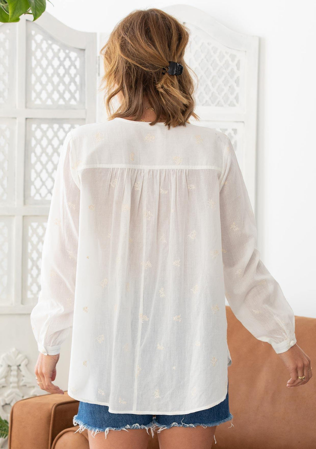 ![[Color: Cloud] A woman wearing a sheer cotton voile button front top. Featuring pretty floral embroidered details throughout, voluminous long sleeves with a button cuff closure, and a large button up front.](http://www.shoplovestitch.com/cdn/shop/products/I-13601W-RLQ-off-white-embroidered-top-9_160x.jpg?v=1755177079)