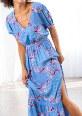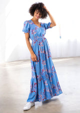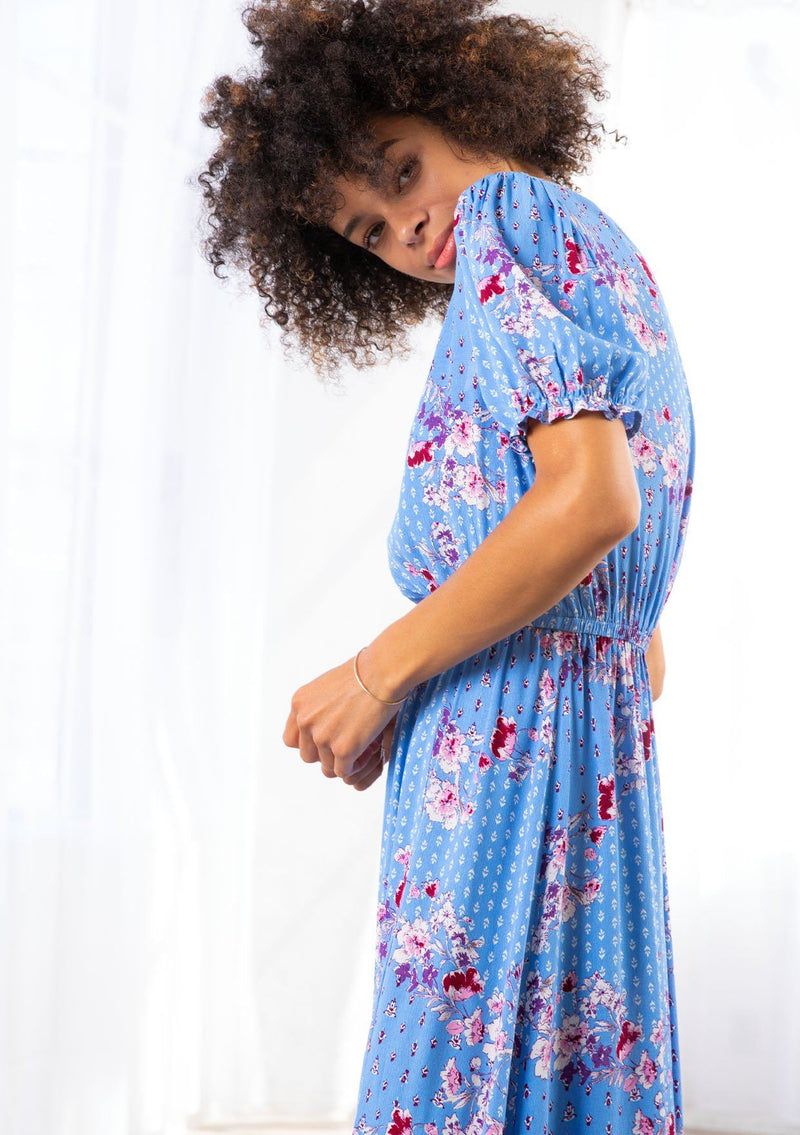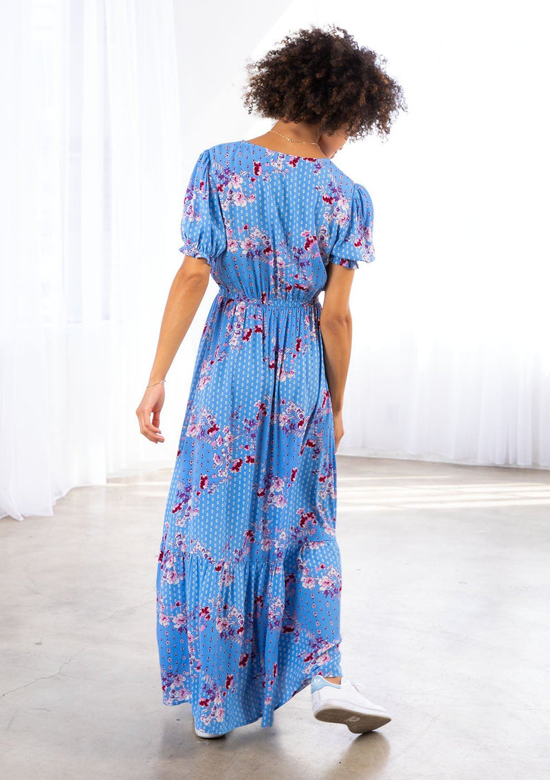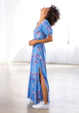 We've redesigned our top-selling maxi dress in a gorgeous azure blue floral print. An ultra-feminine style featuring trendy short puff sleeves, a sexy off-center front slit, and a flirty ruffle-trimmed tiered skirt.