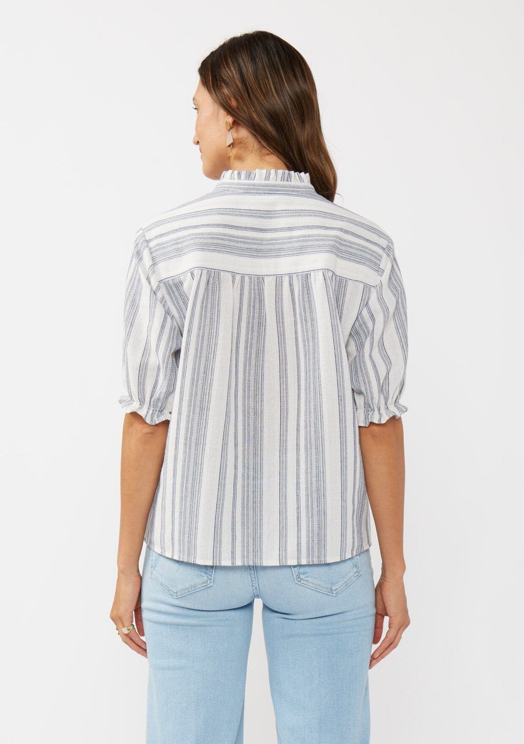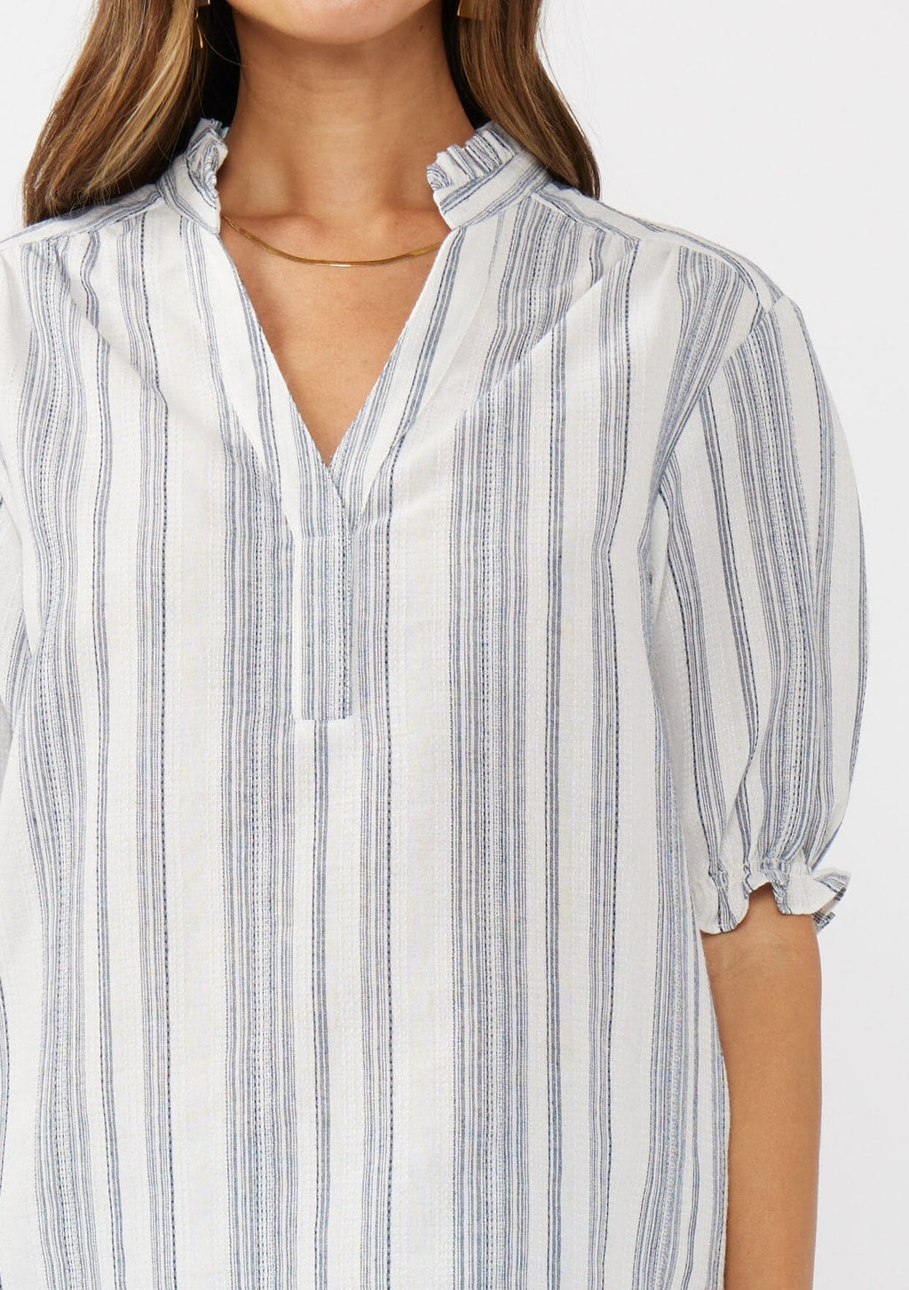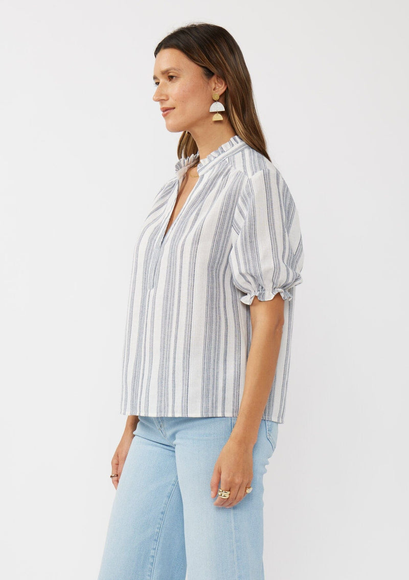 A classic bohemian puff sleeve top in a white & blue yarn dye stripe.
