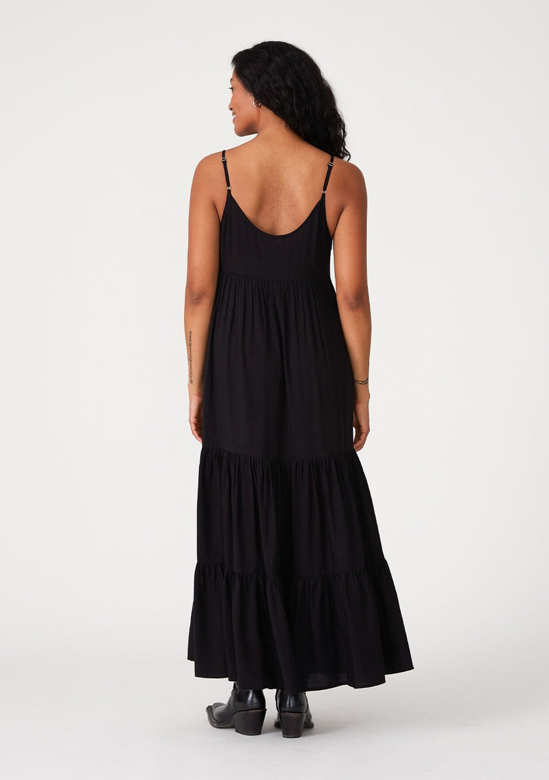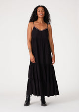 An ultra-flowy black sleeveless maxi dress with contrast thread details.