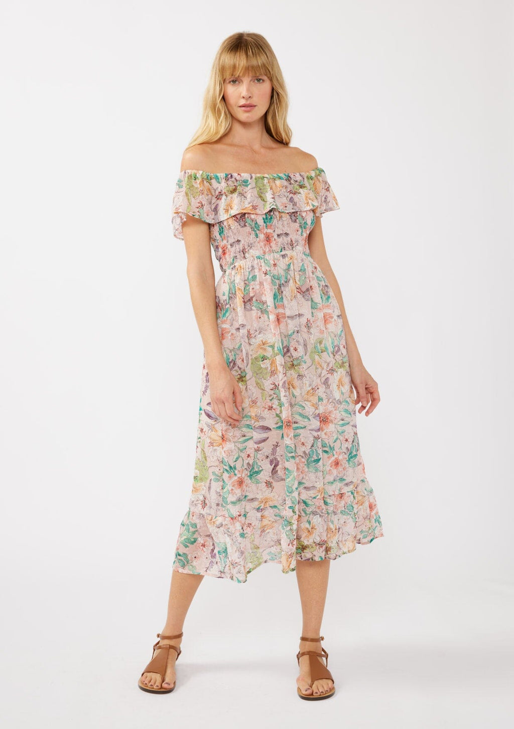 A breezy chiffon midi dress perfect for warm weather, featuring a ruffle-trimmed tiered skirt, a convertible on or off-shoulder neckline, flattering ruffle sleeves, and a smocked bodice. With its breezy fit and effortless movement, this versatile dress adds effortless charm to any special occasion.
