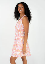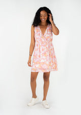 Get ready to bloom this season in our stunning pink floral mini dress! Designed with a flattering surplice v-neckline and a relaxed fit, this sleeveless beauty is perfect for soaking up the sun in style. Whether dressed up with heels or paired with sandals for a casual look, you'll love the effortless elegance of this springtime staple.