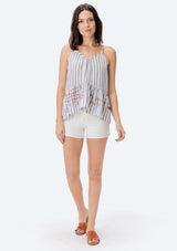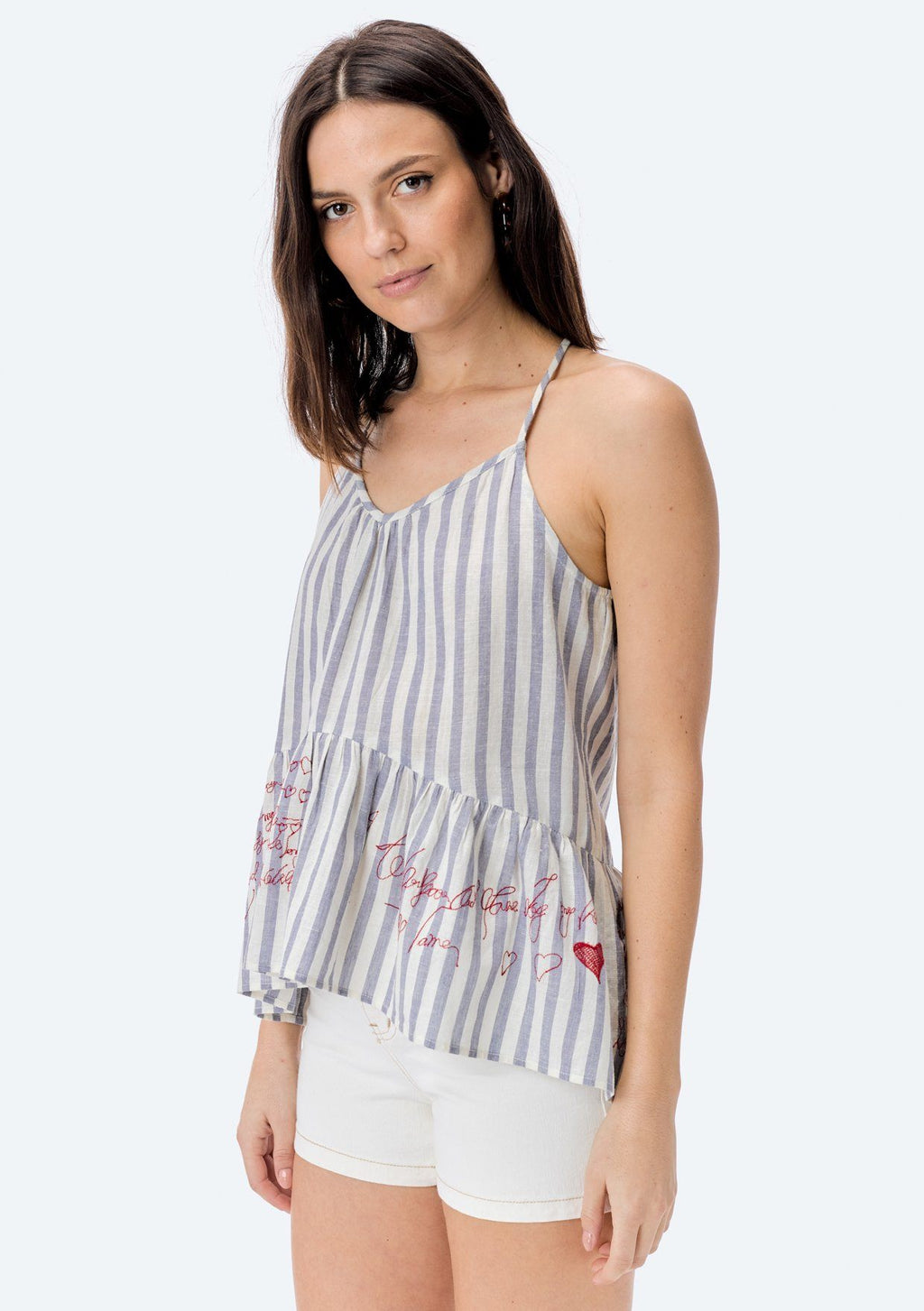 Shop this unique and beautifully billowing striped spaghetti-strapped tank top with a ruffled hem and boho embroidered french writing.