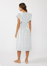 A classic midi dress with flutter sleeves and soft white and blue stripes.