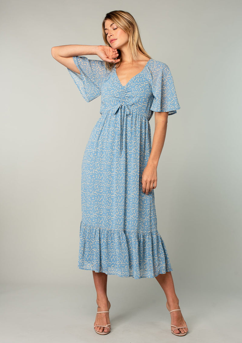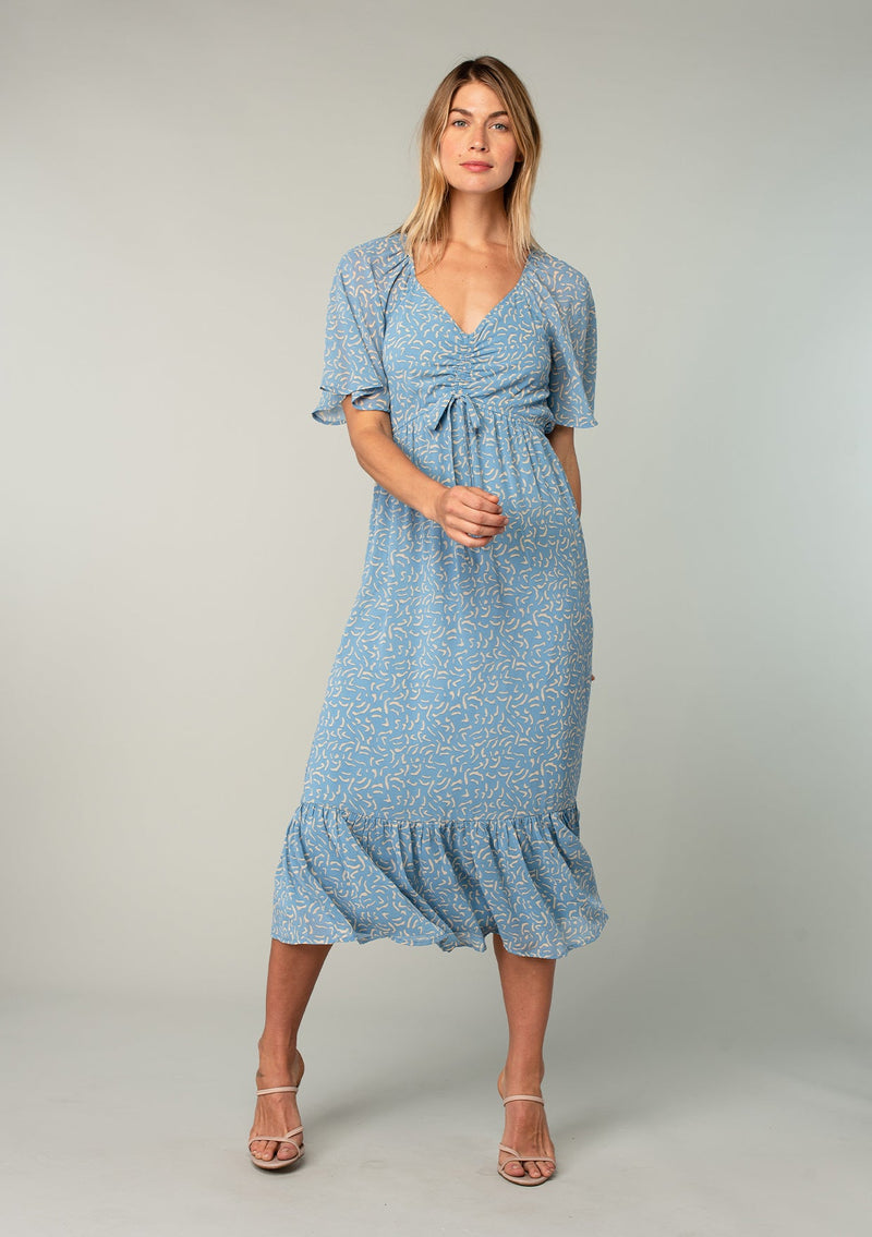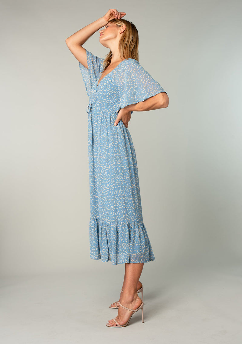 Light floating on air, this dreamy yet refined midi dress is the perfect choice for your next special occasion. Designed in an abstract squiggle print, with short flutter sleeves, a ruched v-neckline, and a flattering empire waist. The tiered skirt adds effortless shape and movement as you walk.