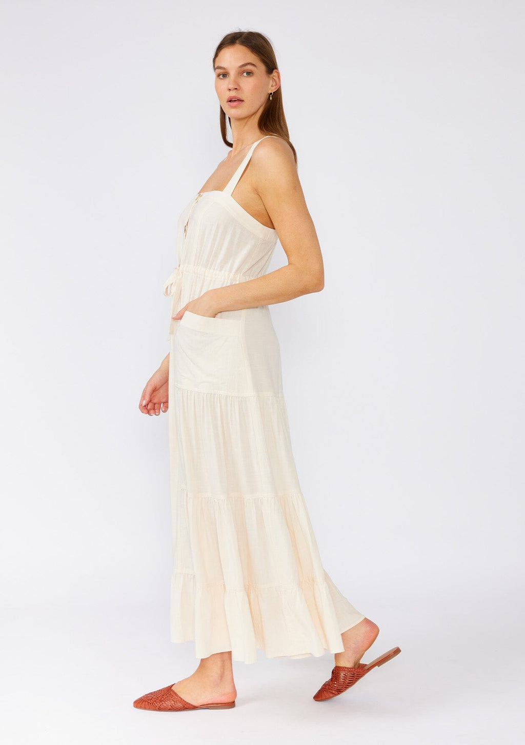 Our tortoiseshell button-front sleeveless maxi dress is this Summer's must-have style! A classic silhouette made from a cool linen-blend featuring a flowy tiered skirt, a charming sweetheart neckline, and front patch pockets. The cross-back straps add a flirty detail to this bohemian maxi dress.