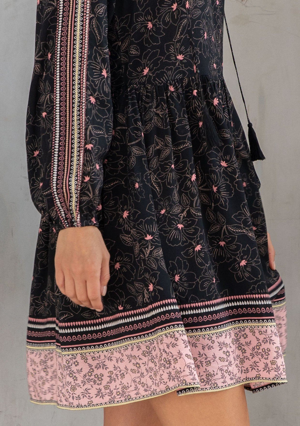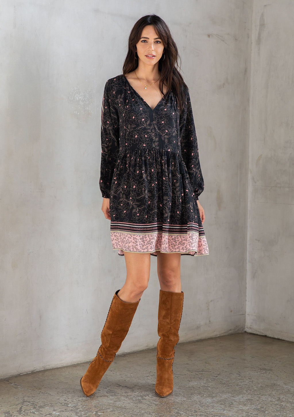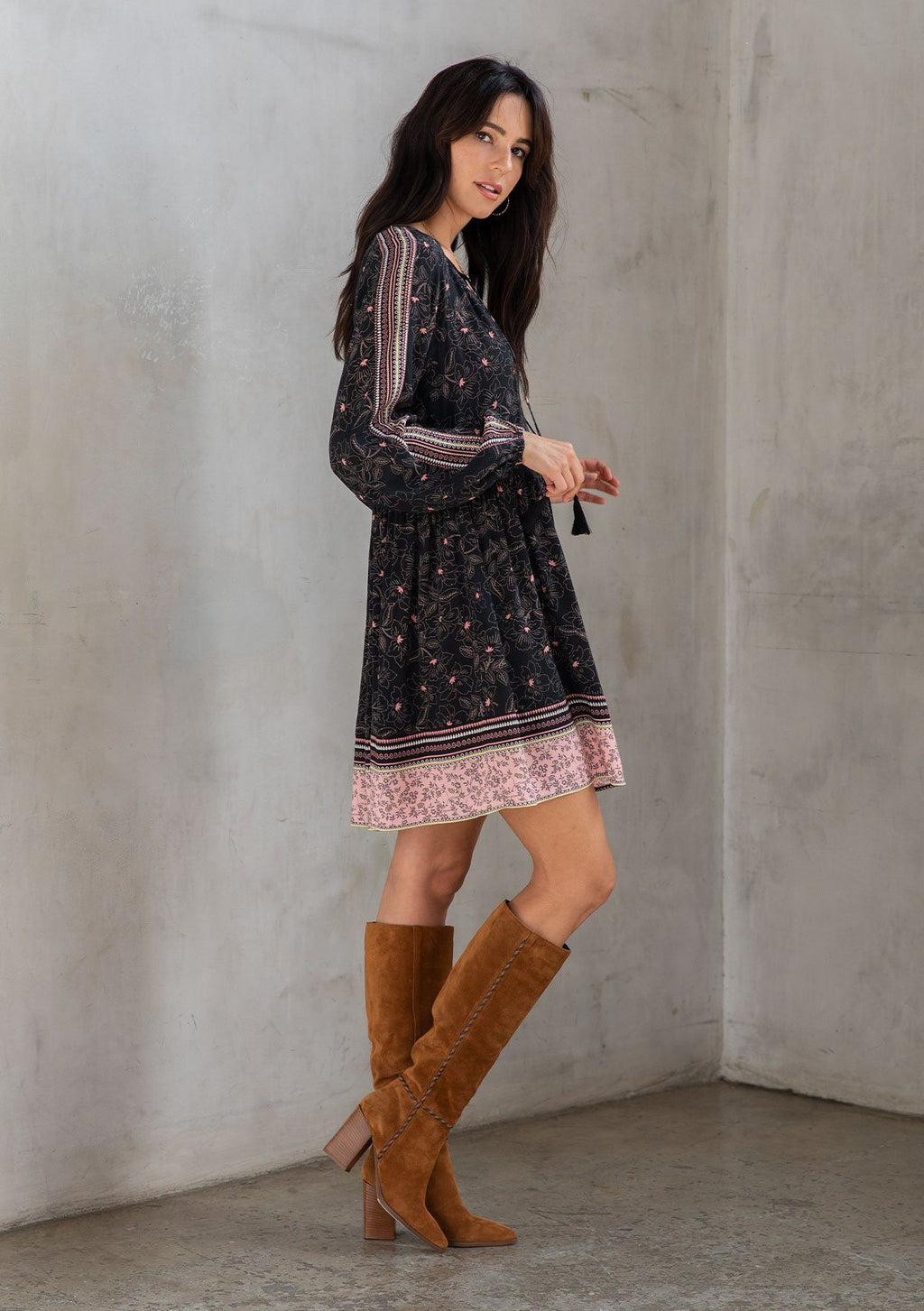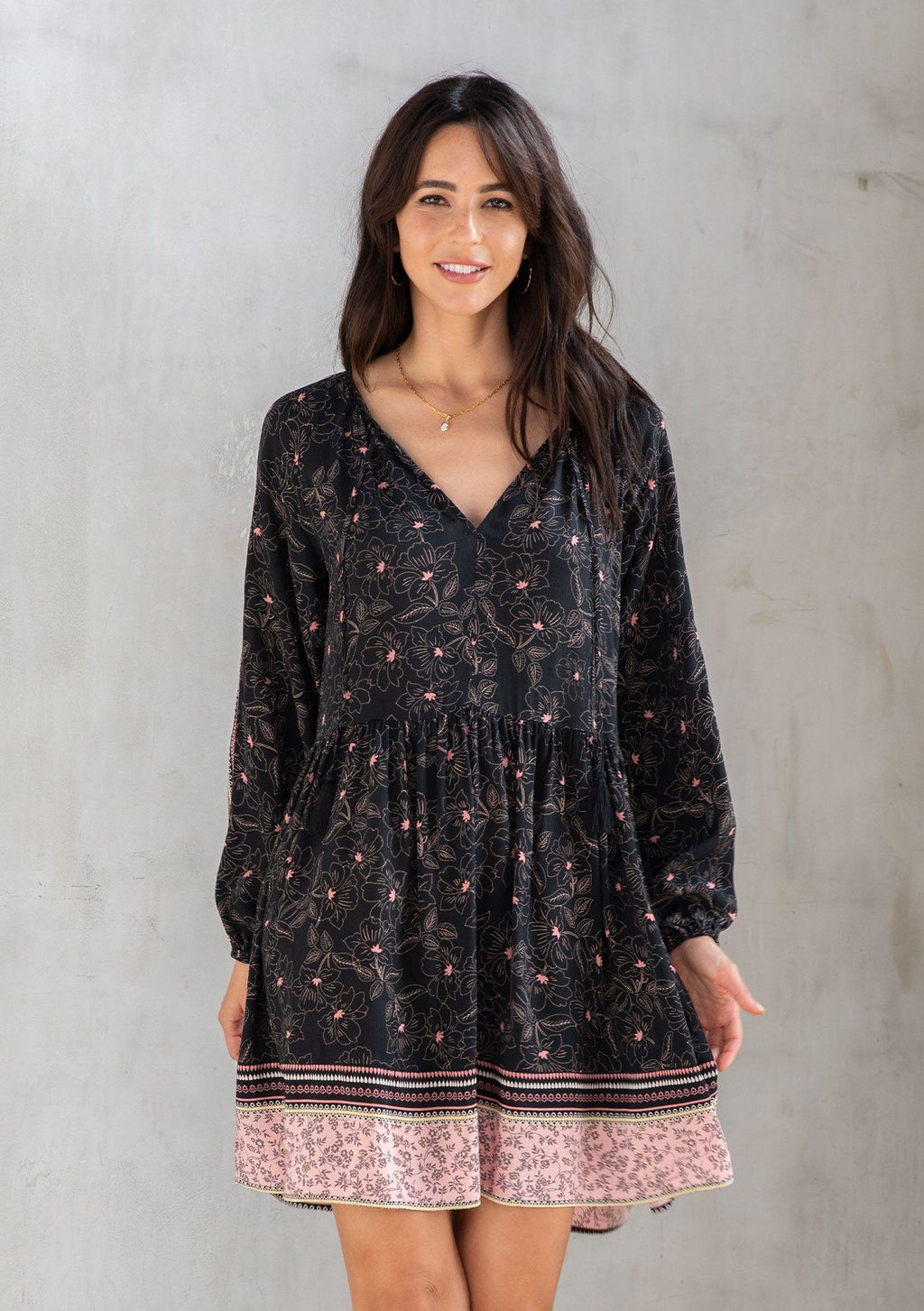 Shop NowAn ultra-flowy style just in time for Spring, our classic bohemian mini dress is designed in a floral border print. Featuring voluminous long sleeves and a flattering split neckline with tassel tie accents. The epitome of throw-on-and-go, this effortless style is perfect for work or play.