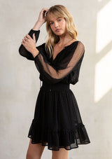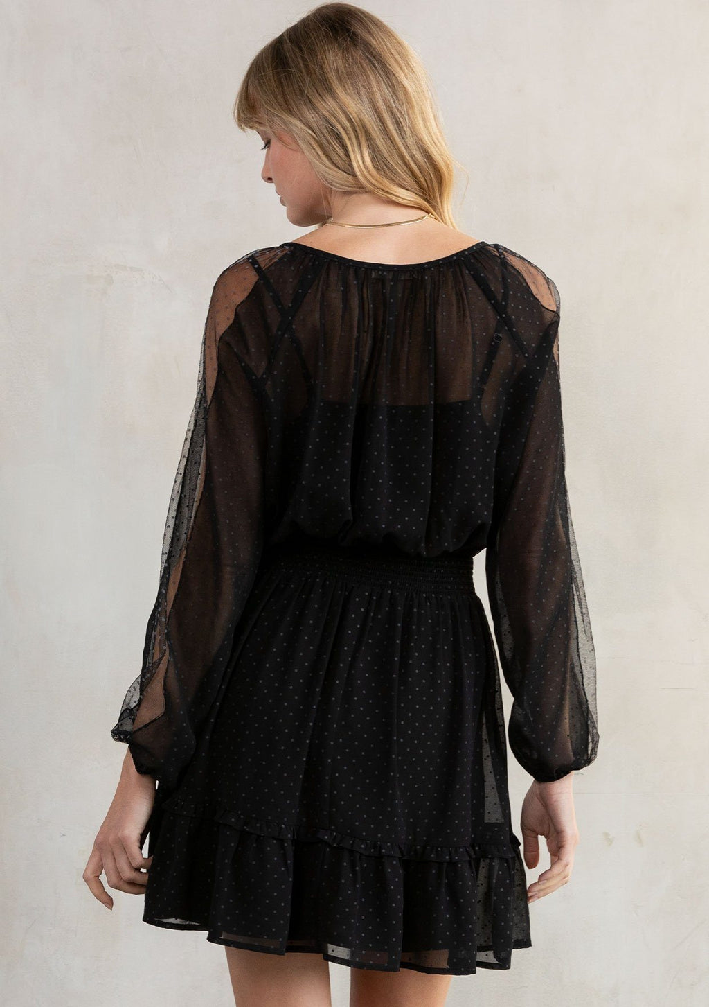 ![[Color: Black] A model wearing a black bohemian mini dress in a dot chiffon. With embroidered mesh trimmed long sleeves, an embroidered front detail, a smocked elastic waist, a split v neckline with ties, and a ruffle trimmed tiered skirt.](http://www.shoplovestitch.com/cdn/shop/products/I-72439WL-ROB_BLACK-D_160x.jpg?v=1748483319)