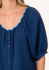 A contrast thread detail adds a unique charm to this classic bohemian blouse. Designed in soft cotton gauze, featuring raglan puff sleeves, a flattering scooped neckline, and a button front.