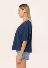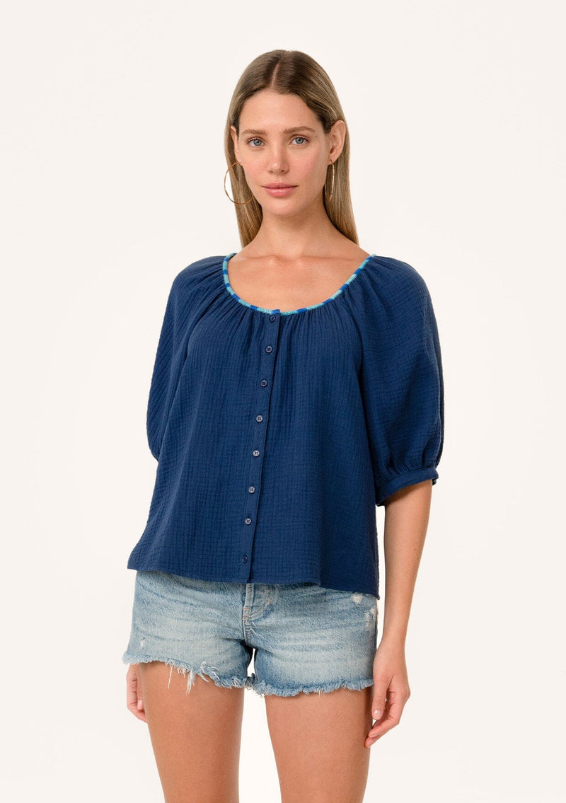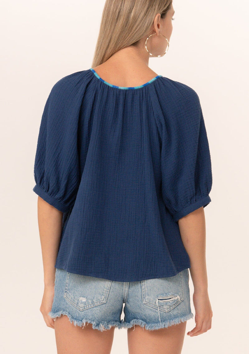 A navy blue bohemian puff sleeve blouse designed in soft cotton gauze.
