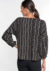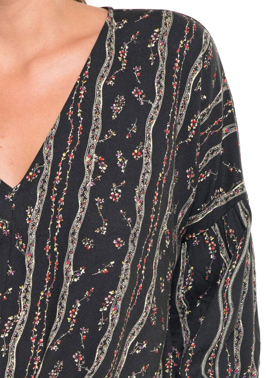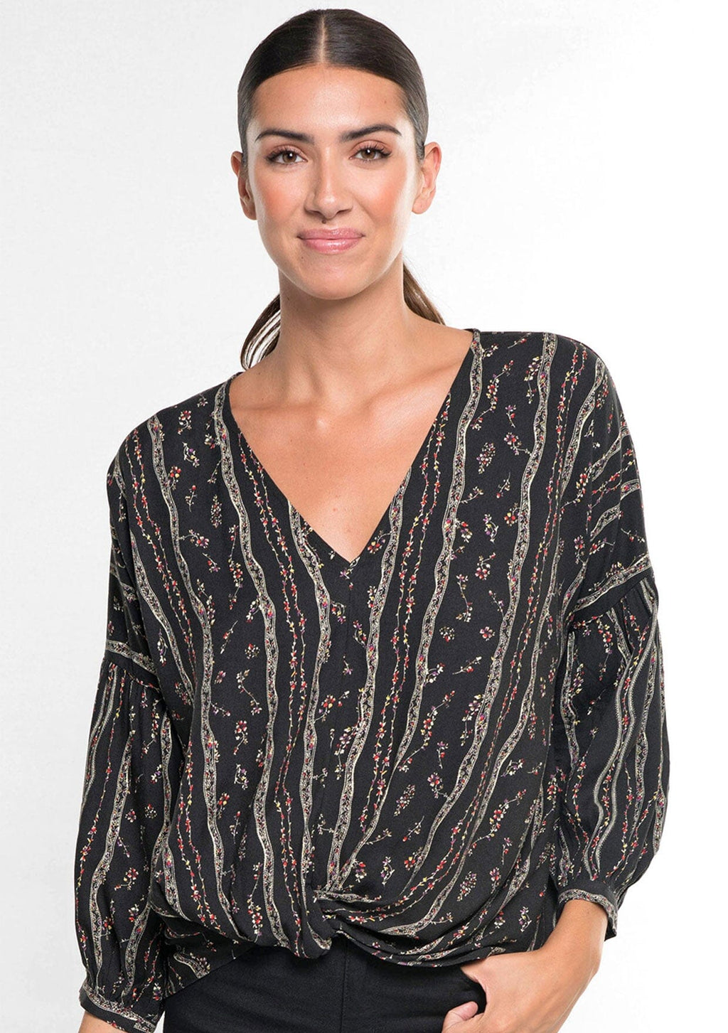 Floral printed long sleeve top with v-neck and twist front detail.