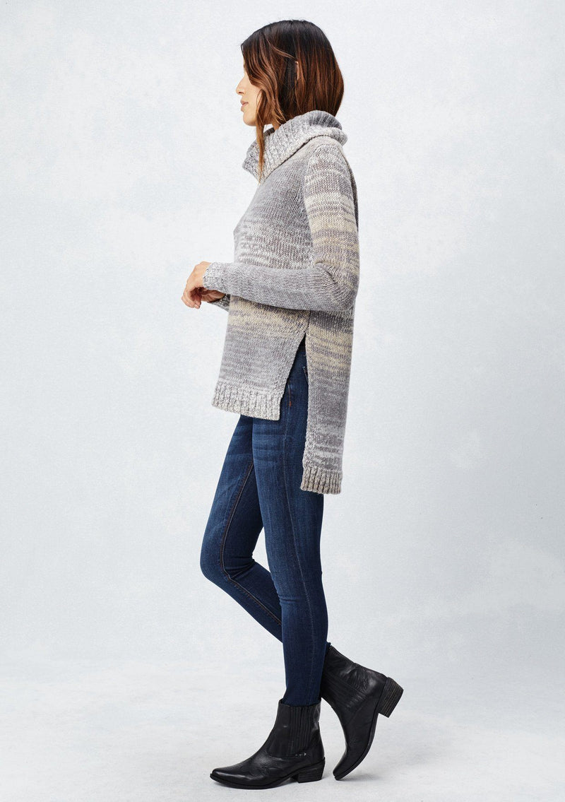 Cozy relaxed fit grey turtle neck sweater with flattering side slits and high-low hem. A chic and comfortable fall pullover sweater.