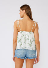 Welcome the season with this flowy white cotton bohemian tank top, accented with stunning green palm embroidery. Its relaxed fit and sleeveless design keep things cool and casual, while the gently ruffled neckline and rope straps with gold metallic details add a touch of elegance. Adjustable shoulder ties offer a custom fit, and the lining ensures an extra layer of comfort. Perfect for a carefree summer look!