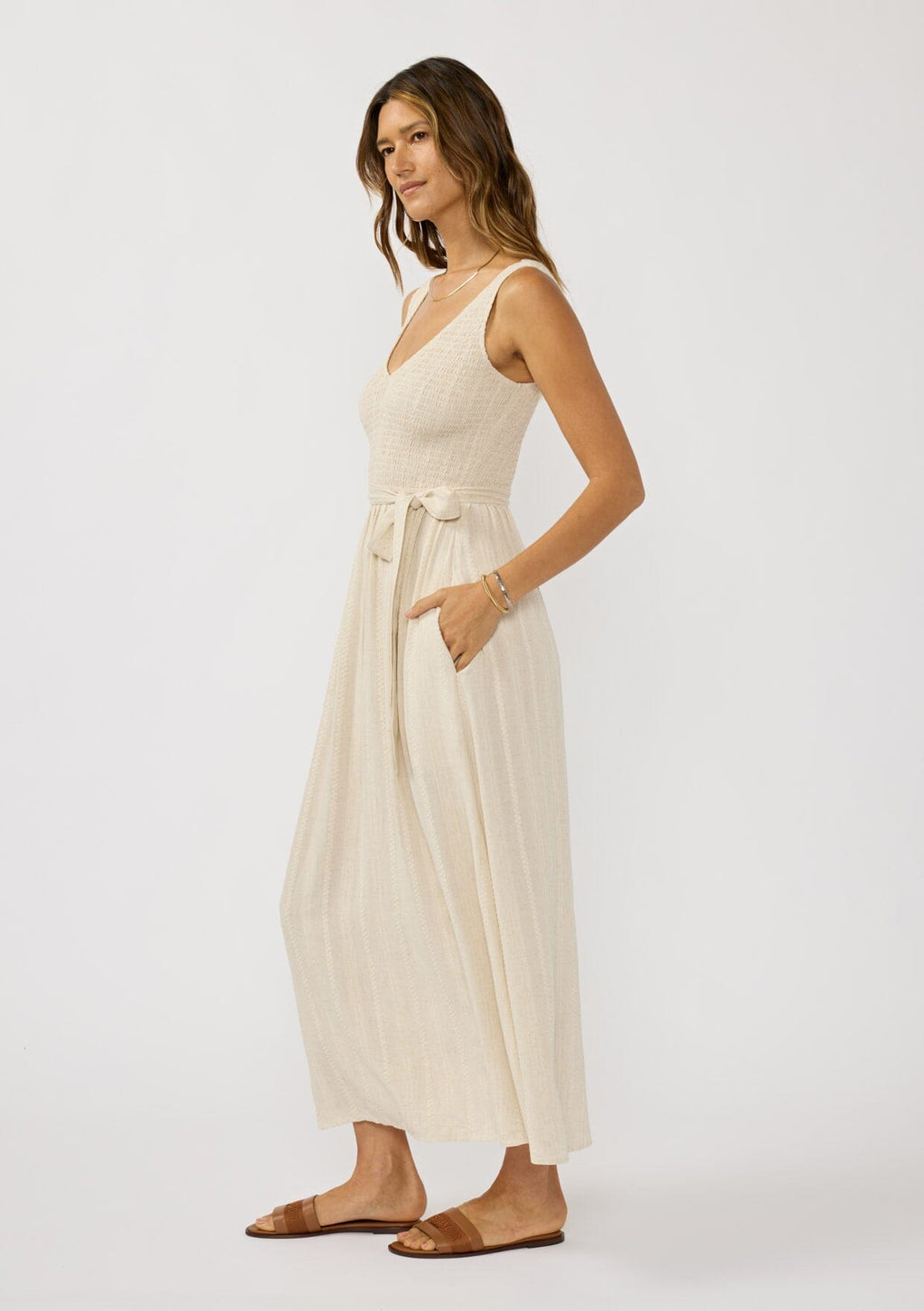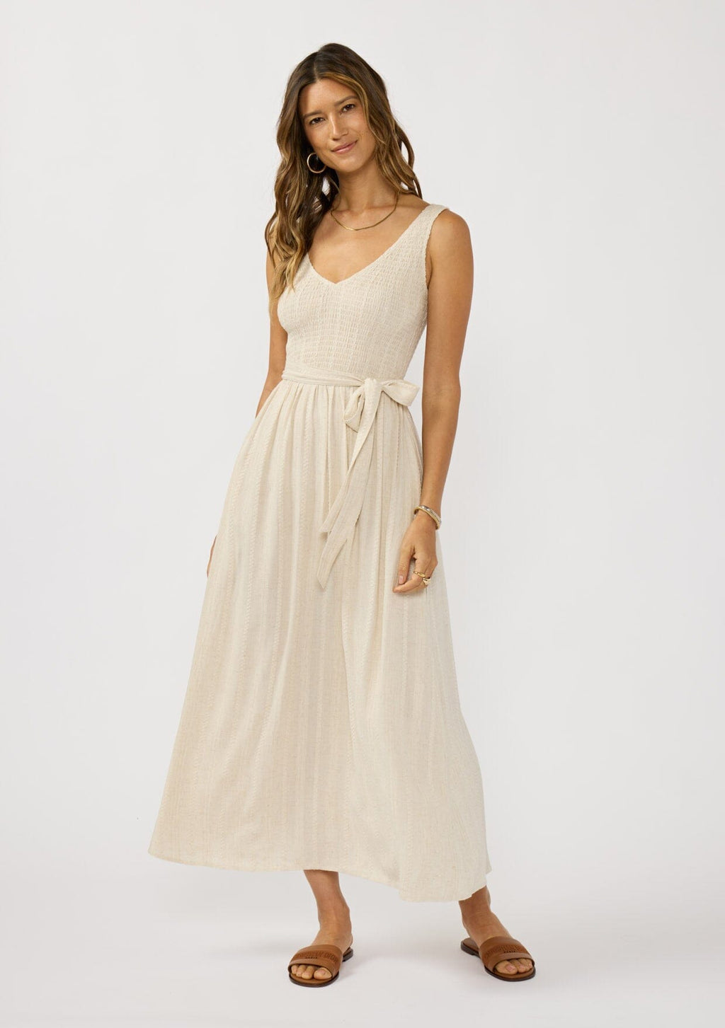 ![[Color: Natural] A side facing image of a brunette model wearing a beige jacquard midi dress with a smocked bodice, v-neckline, adjustable waist belt, and side pockets.](http://www.shoplovestitch.com/cdn/shop/files/LOVESTITCH_20251201_22_160x.jpg?v=1765521368)