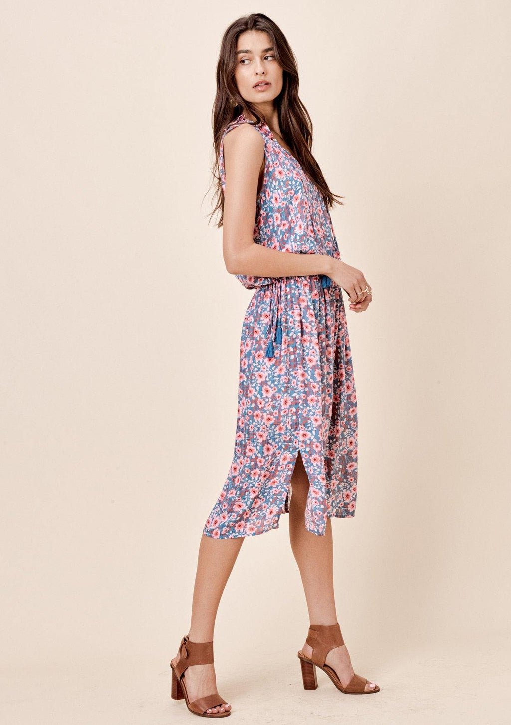 Shop The SaleStep into Summer in our effortlessly cute mid-length tank dress! Featuring a pretty floral print, boho tassel neckties, and ruffle neck detail. An easy boho dress for the office or running errands!