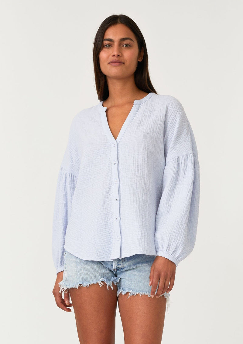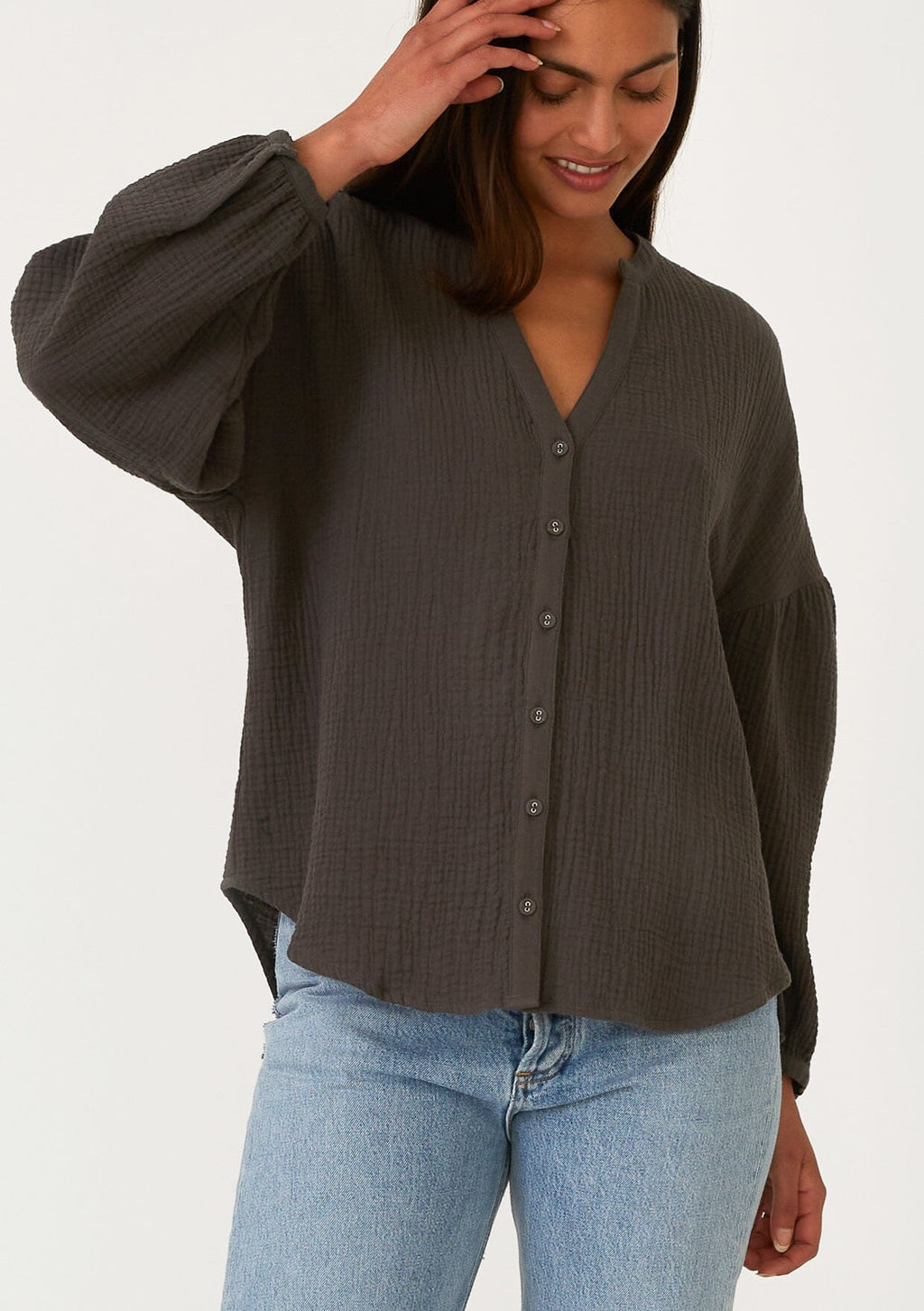 An instant classic, our effortlessly chic bohemian blouse is crafted from soft cotton gauze. With long voluminous sleeves, a v-neckline, and a delicate self-covered button front. The perfect throw-on-and-go blouse for any season.