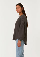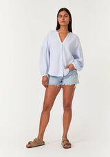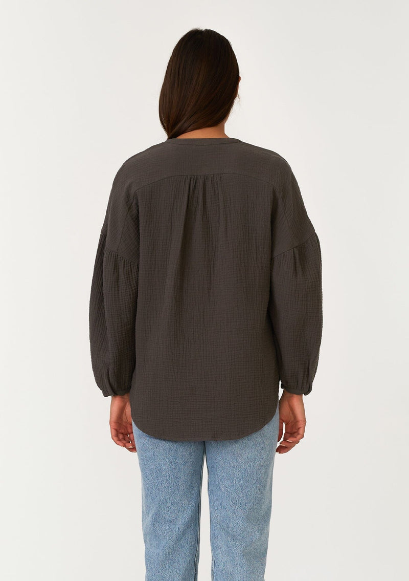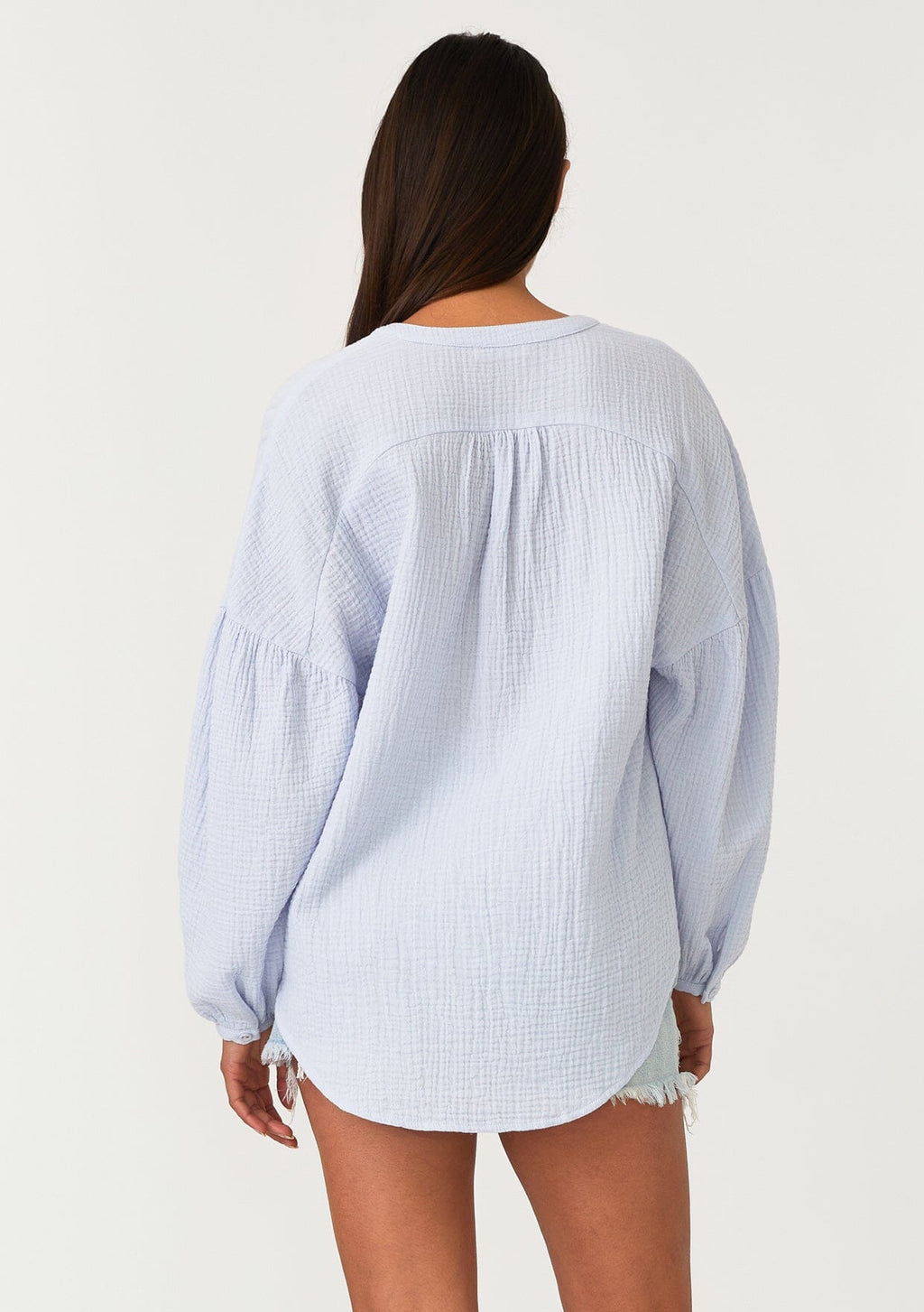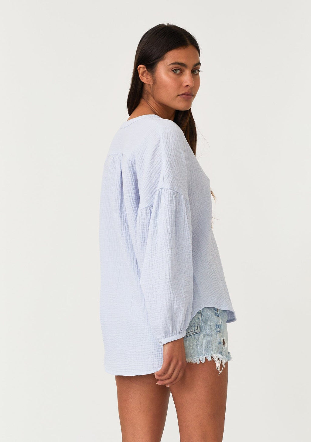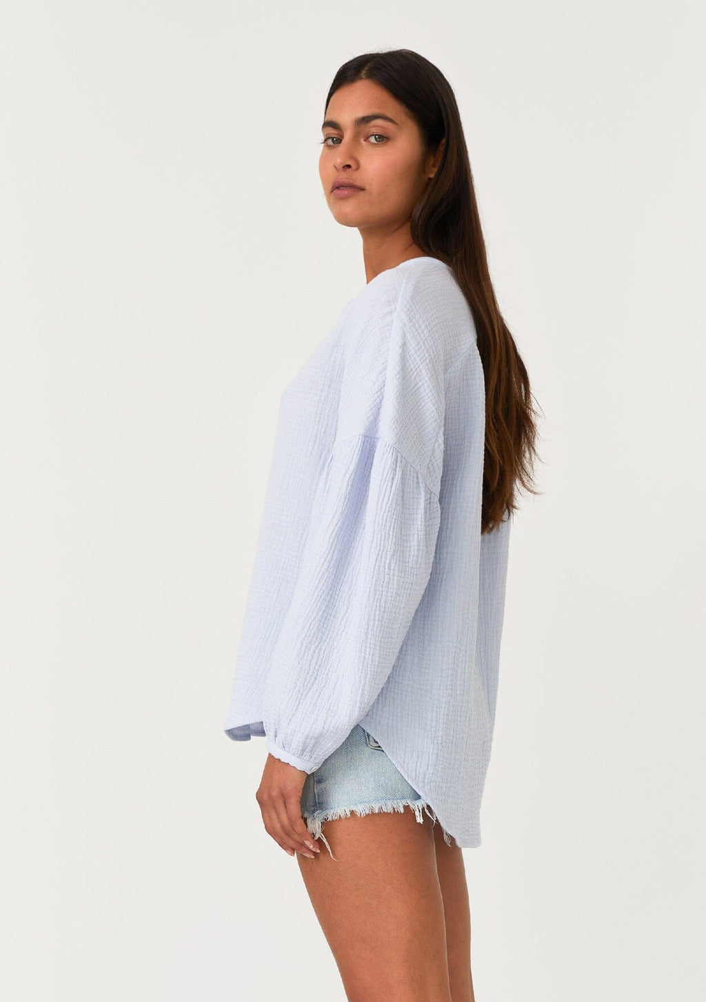 A simple voluminous long-sleeve bohemian blouse designed in soft cotton gauze.