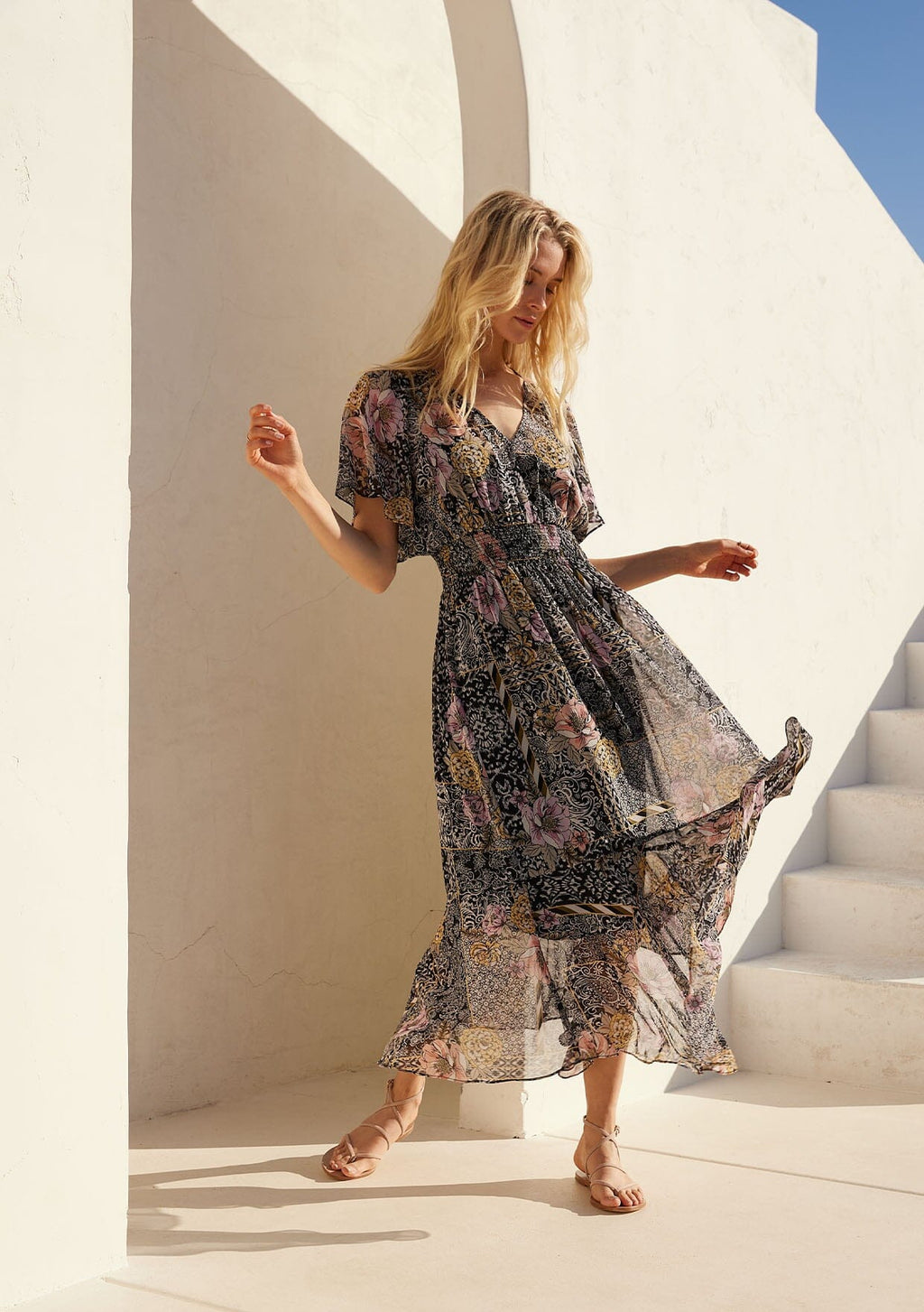 Shop The SaleA bohemian chiffon maxi dress designed in a black and pink mixed floral print.