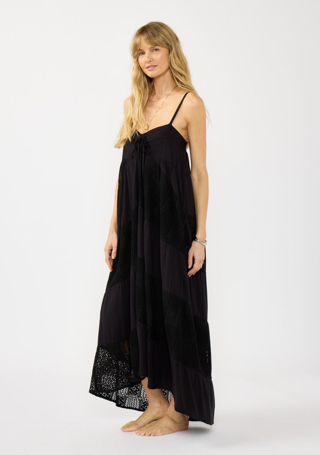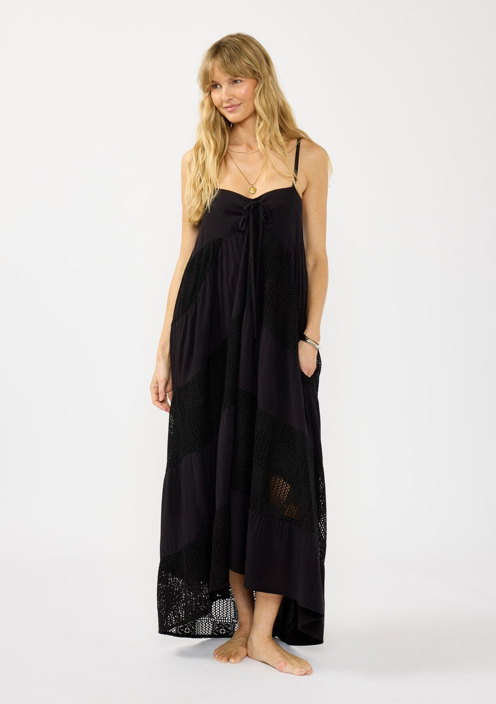 An effortlessly flowy maxi dress with delicate lace patchwork details.
