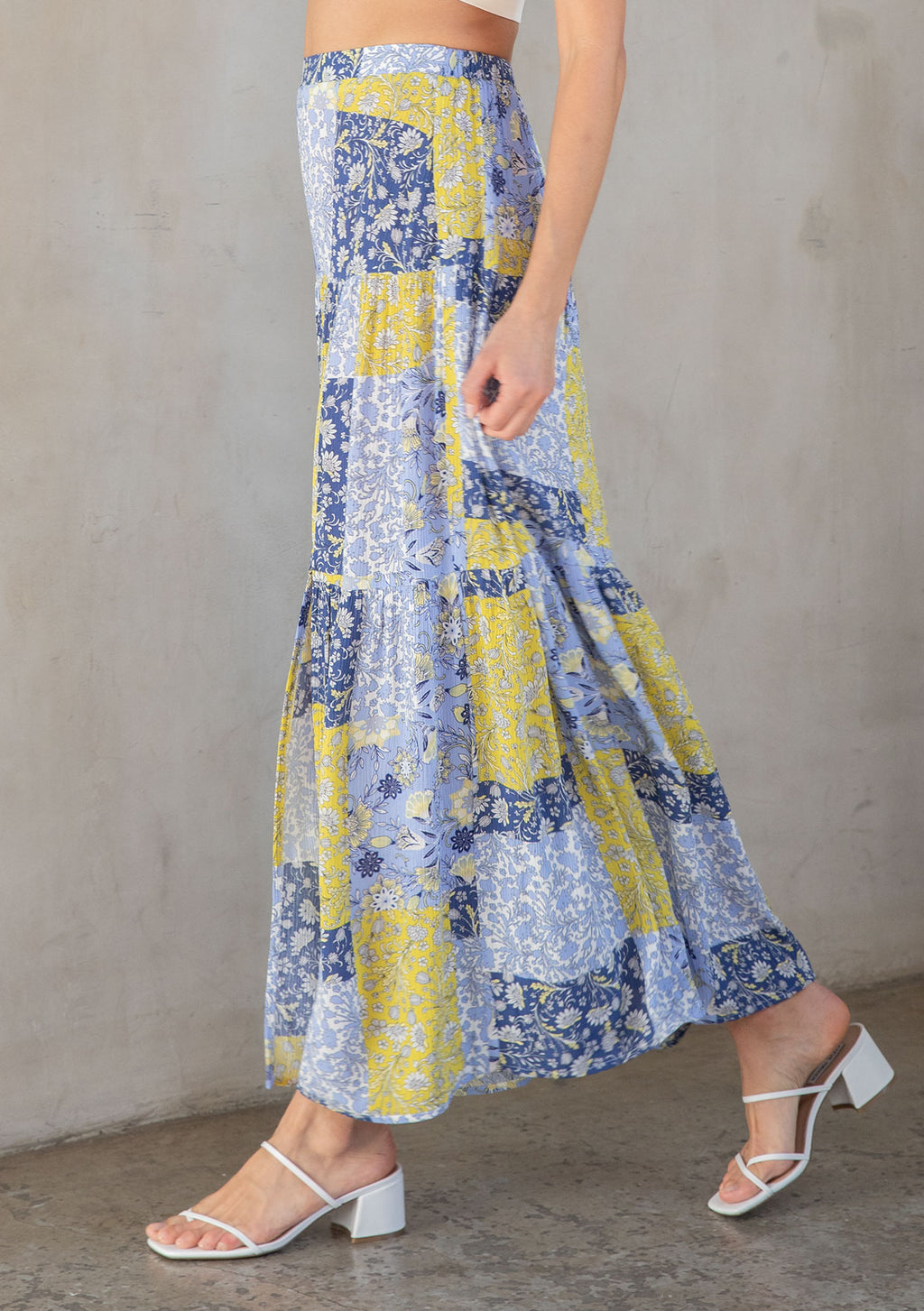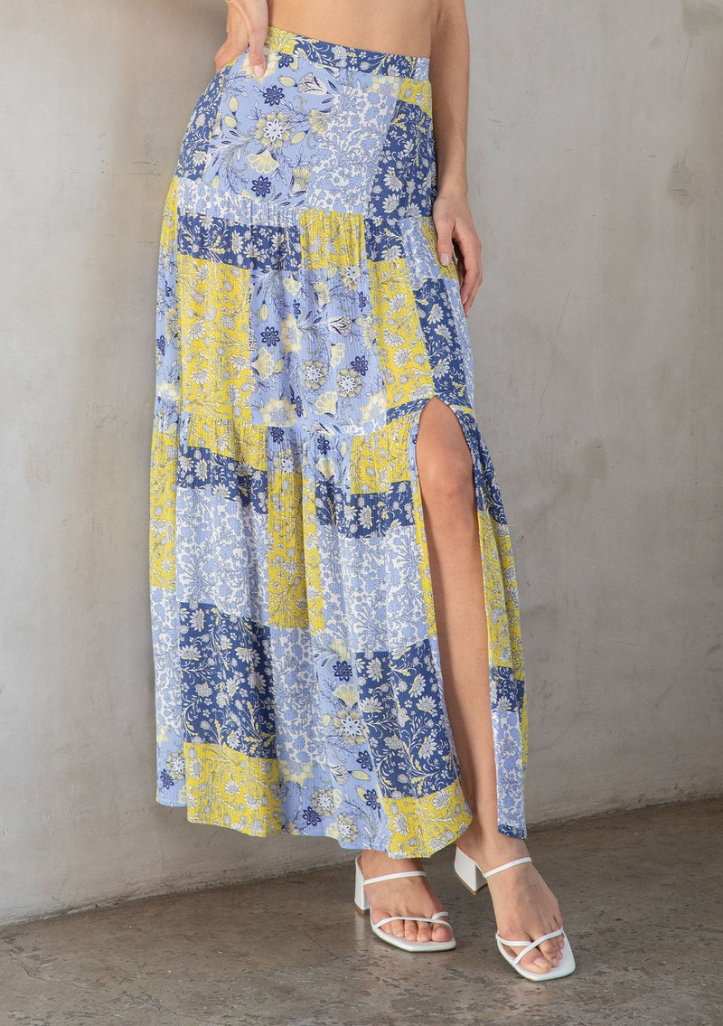 A dreamy maxi skirt designed in a stunning floral patchwork print. With a leg-baring side slit and a tiered skirt for added shape and movement. A versatile style for Spring, we love to style it over our swimsuit at the beach.