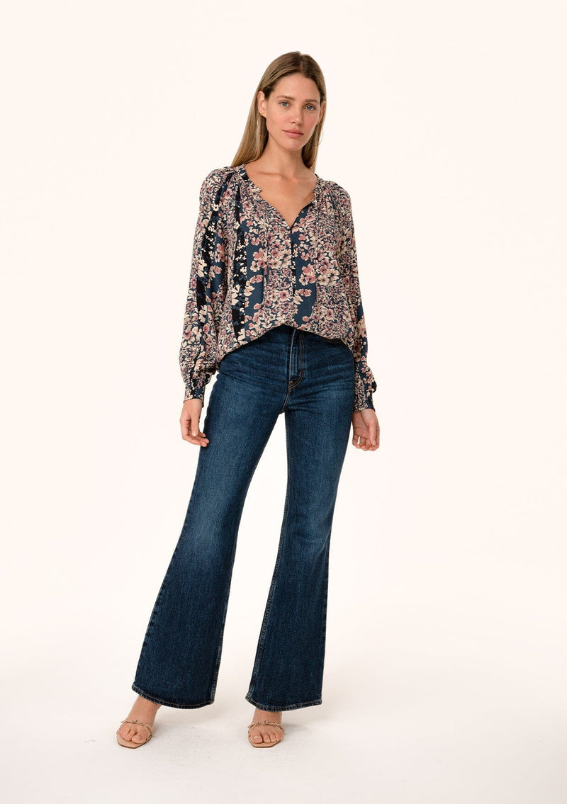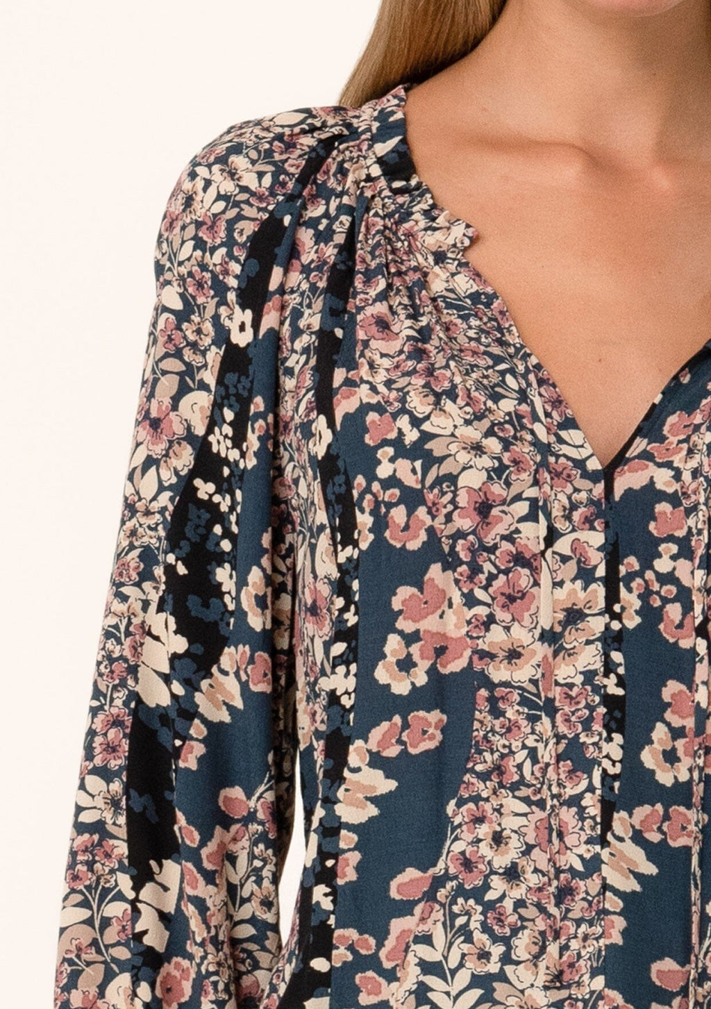 A feminine mixed floral print adds interest to this classic bohemian blouse. Featuring long voluminous sleeves, a flattering split v-neckline with ties, and flirty ruffled details. We love to pair this effortless top with jeans for a casual vibe, or dressed up with classic trousers and a simple sandal.