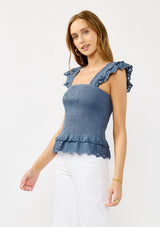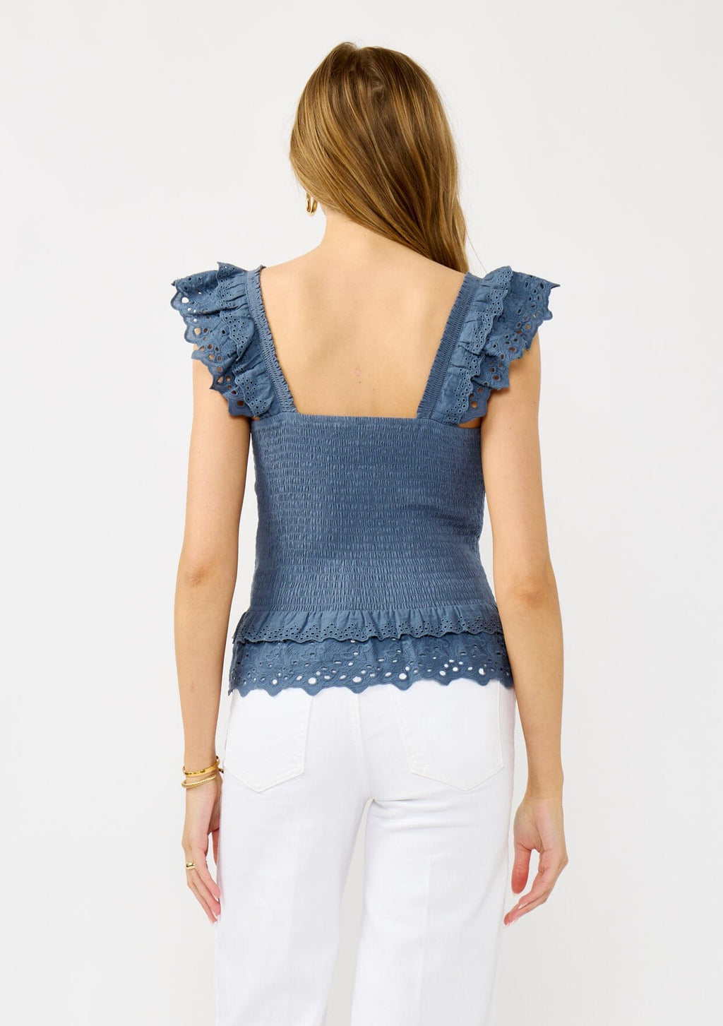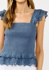 The perfect mix of playful and feminine, this smocked top with ruffled sleeves is made for sunny, easygoing days. Featuring delicate eyelet details, it pairs effortlessly with your favorite denim for a timeless summer look. Whether you're dressing it up for a special occasion or keeping it casual, it's a warm-weather favorite you'll reach for again and again.