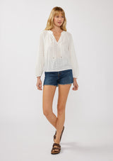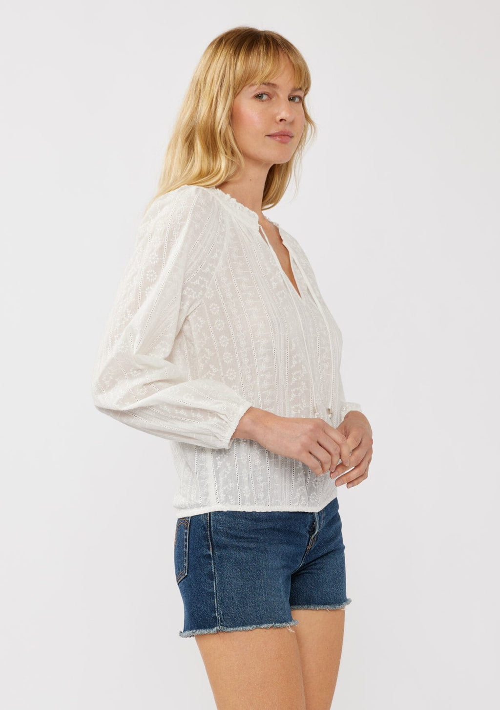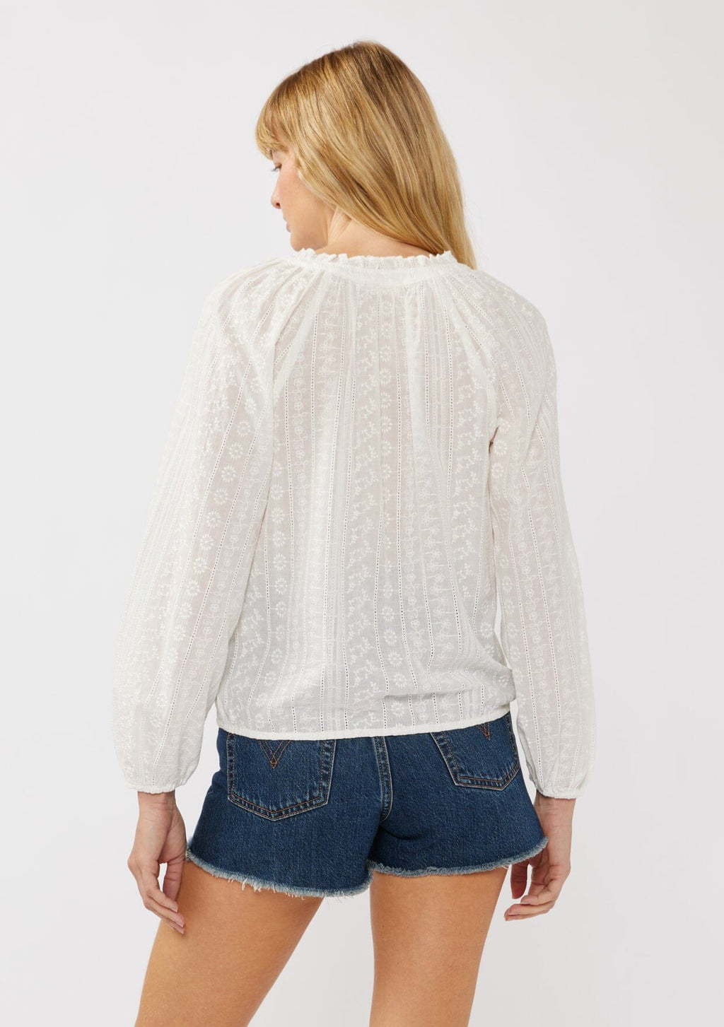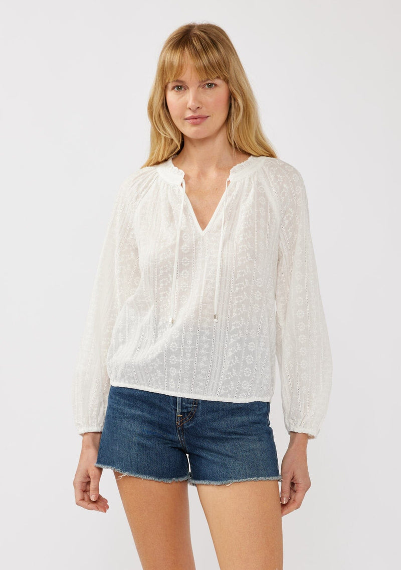 ![[Color: White] A front facing image of a blonde model wearing a white cotton top with floral embroidery. This sheer top features a split v-neckline with ties, long sleeves with elastic cuffs, and an elastic hemline.](http://www.shoplovestitch.com/cdn/shop/files/10252024_182_160x.jpg?v=1748478422)