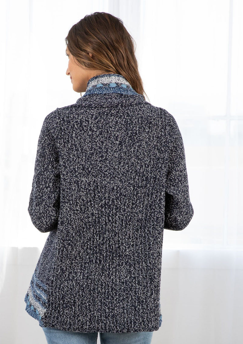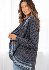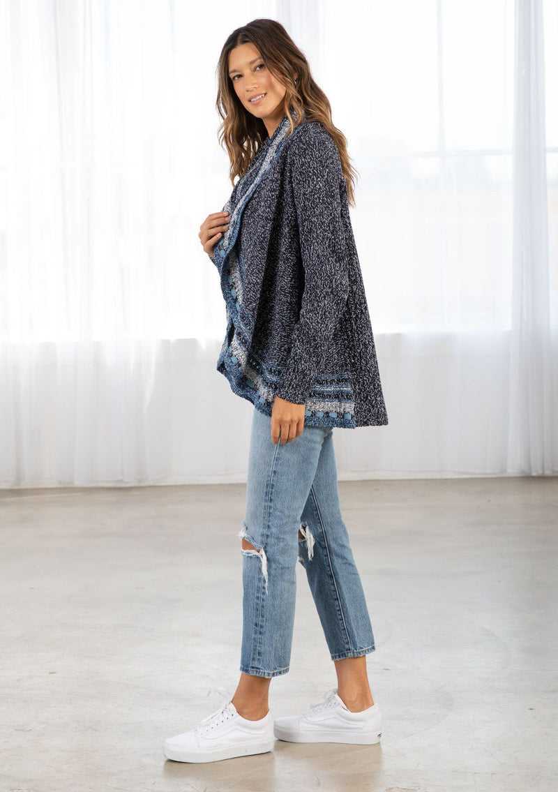 Staying cozy never looked so good! Our dreamy melange knit cardigan features an easy open front, warm long sleeves, and a unique basketweave ribbon trim detail. Perfect for chilly Fall days, this effortless style pairs well with denim.