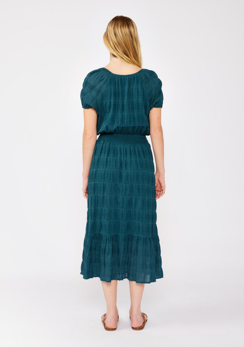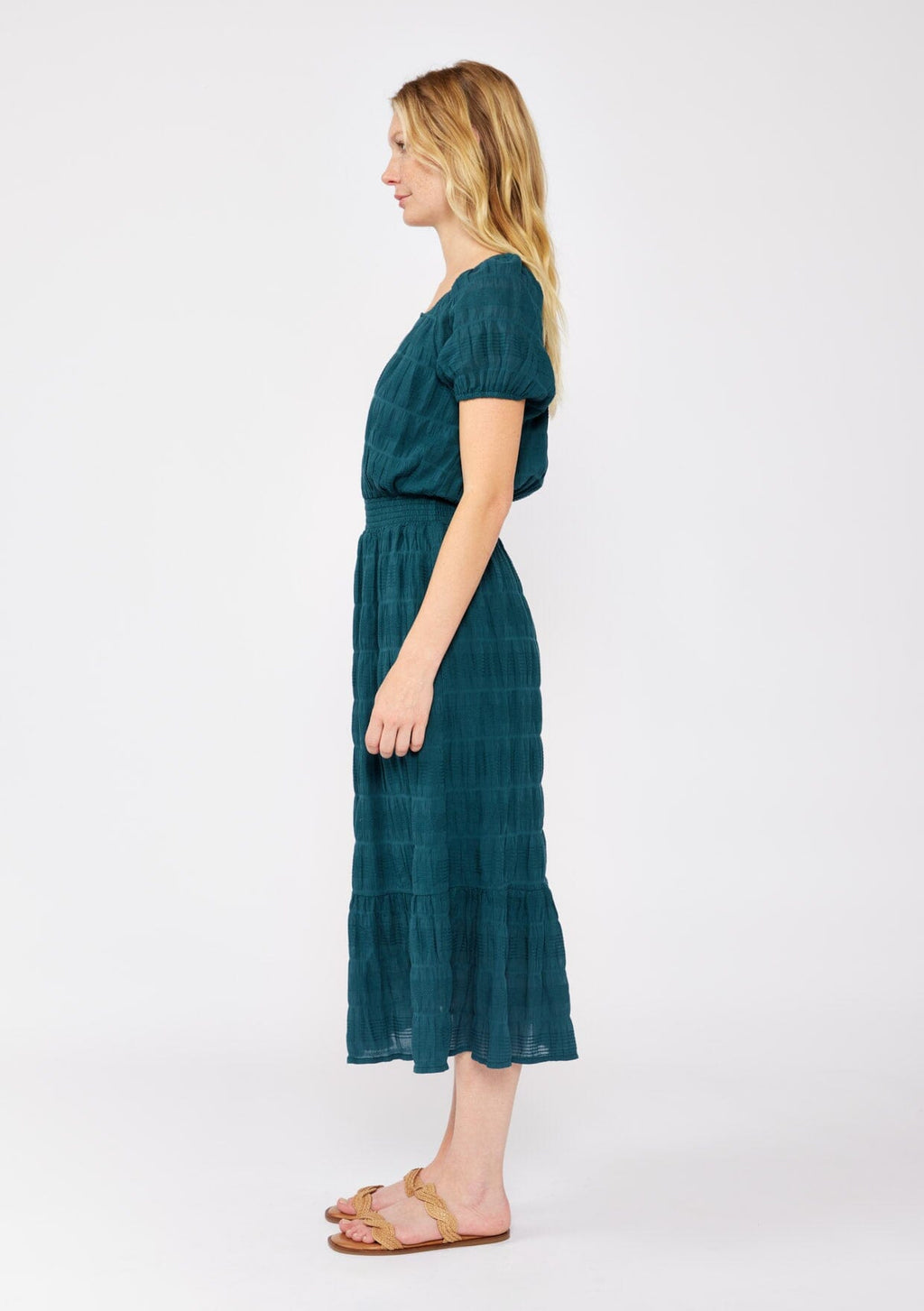 A timeless mid-length dress that transitions effortlessly from day to night. Made from a comfortable puckered fabric with an elegant textured woven jacquard stripe. Featuring an elastic waist for definition, puff sleeves, and a flowy skirt. Perfect for daytime backyard parties or a romantic evening out with a simple shoe change.