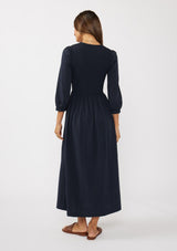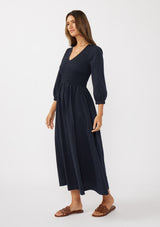 A timeless boho maxi dress with a cottage core touch. Featuring a flattering V-neckline, smocked bodice, 3/4 length sleeves, and functional side pockets, it’s the perfect mix of comfort and style. Its effortless silhouette makes it a versatile choice, whether you're dressing up for an event or keeping it casual for a night out.