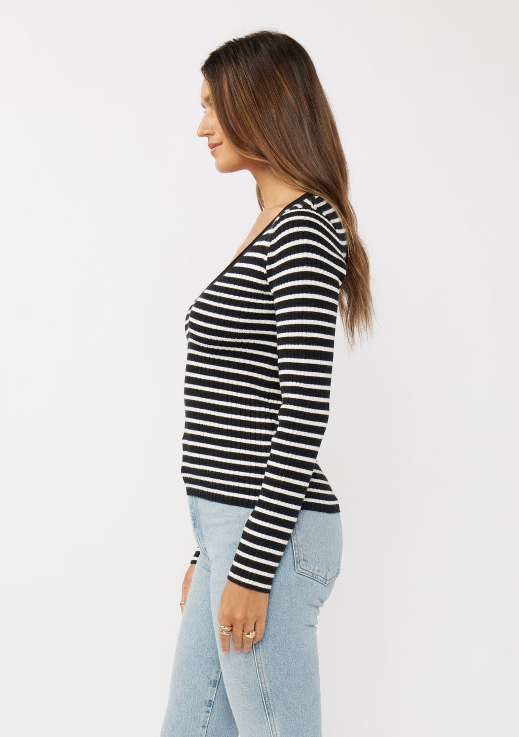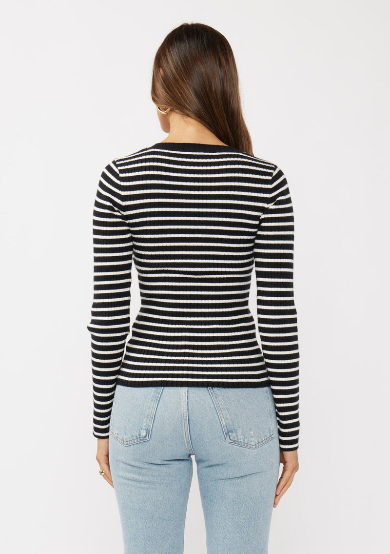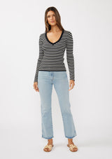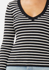 This striped sweater is a total classic, with a flattering v-neckline and cozy ribbed texture. Its fitted shape adds just the right touch of style, making it easy to throw on and go. Perfect for a breezy day or as a go-to layer, this piece will quickly become a staple in your everyday wardrobe.