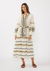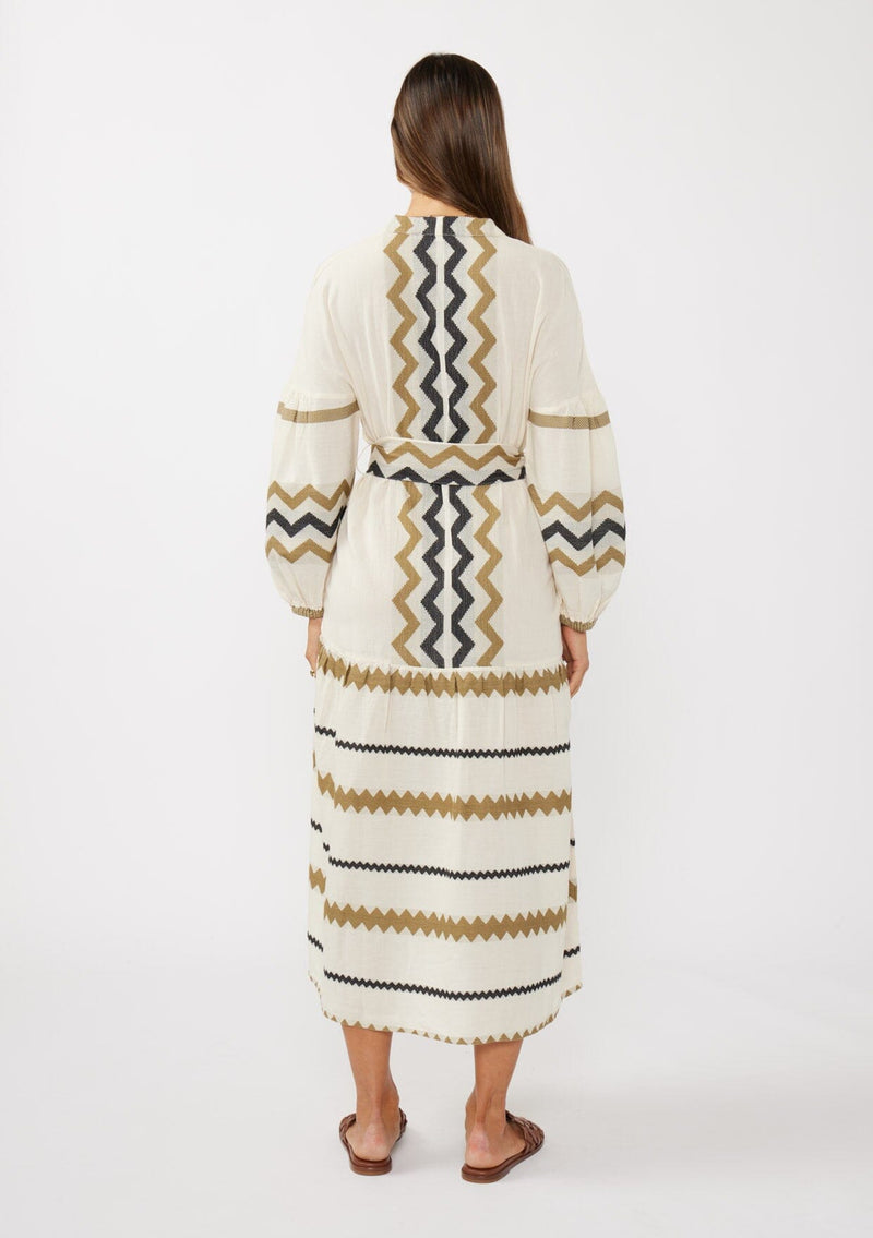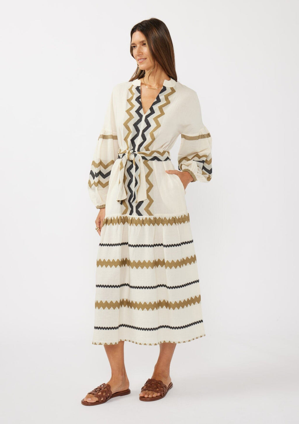 A boho spring maxi dress with a unique zigzag jacquard pattern.