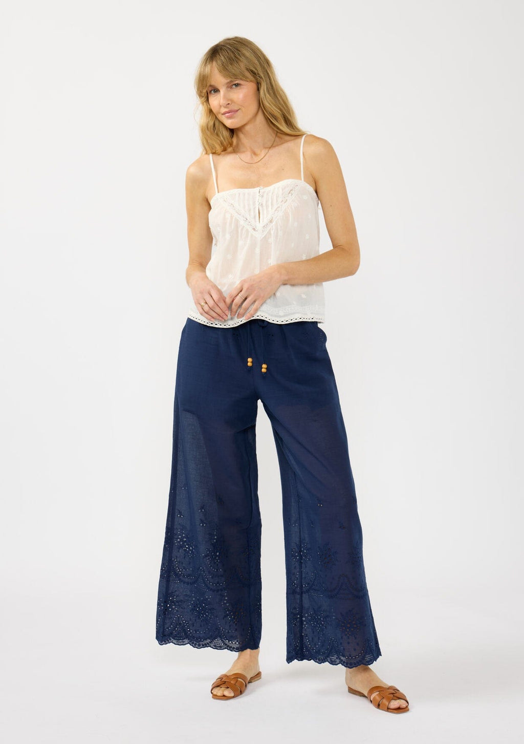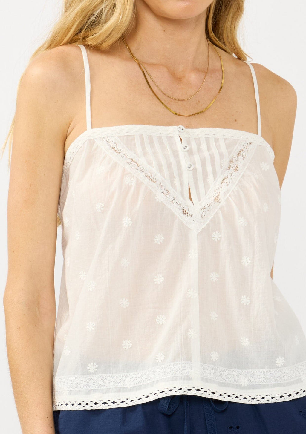 We love this lightweight bohemian camisole for its delicate details and airy fit. It adds a chic touch to your spring wardrobe, serving as an elevated staple that can be styled coastal, casual, or dressed up.