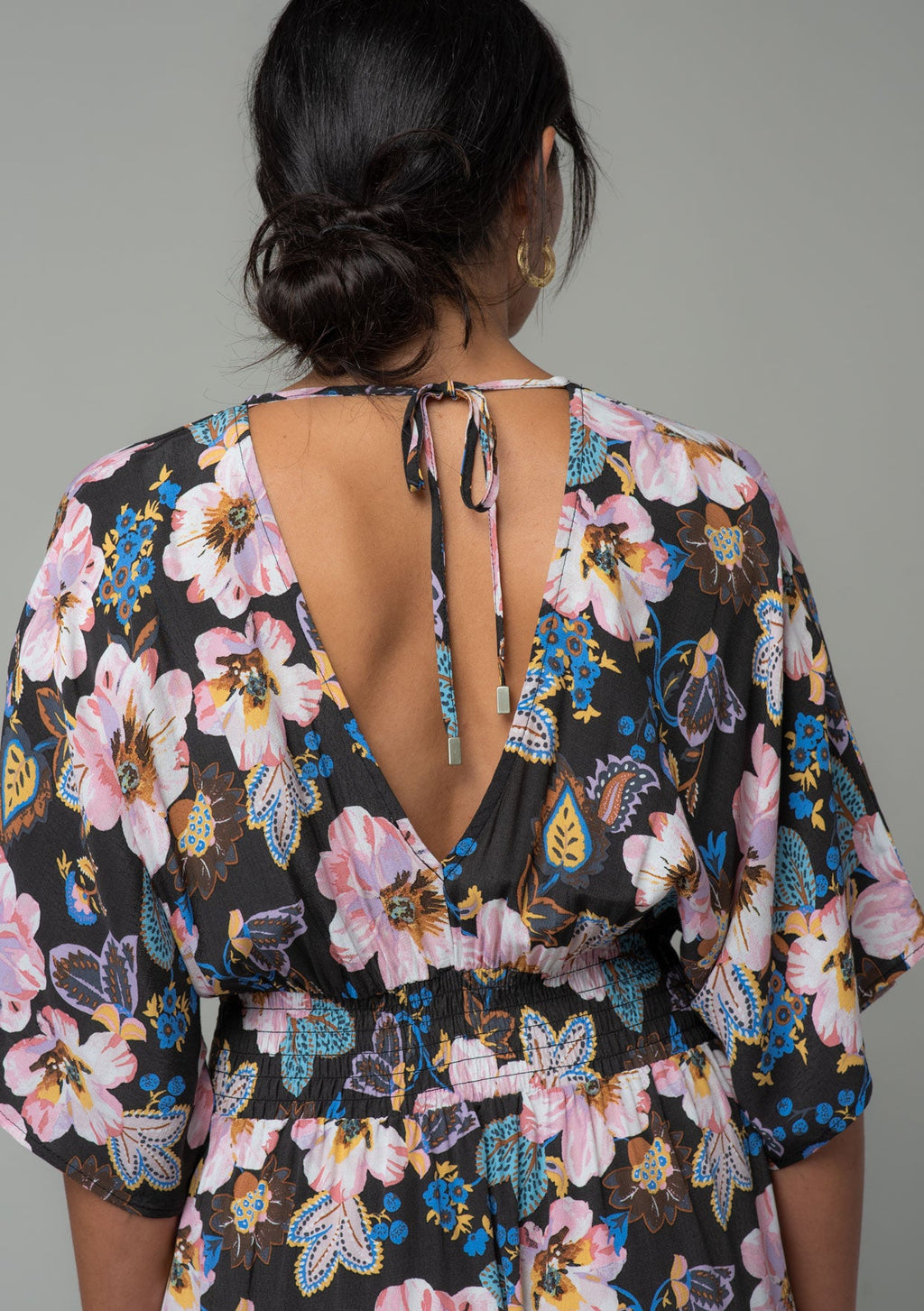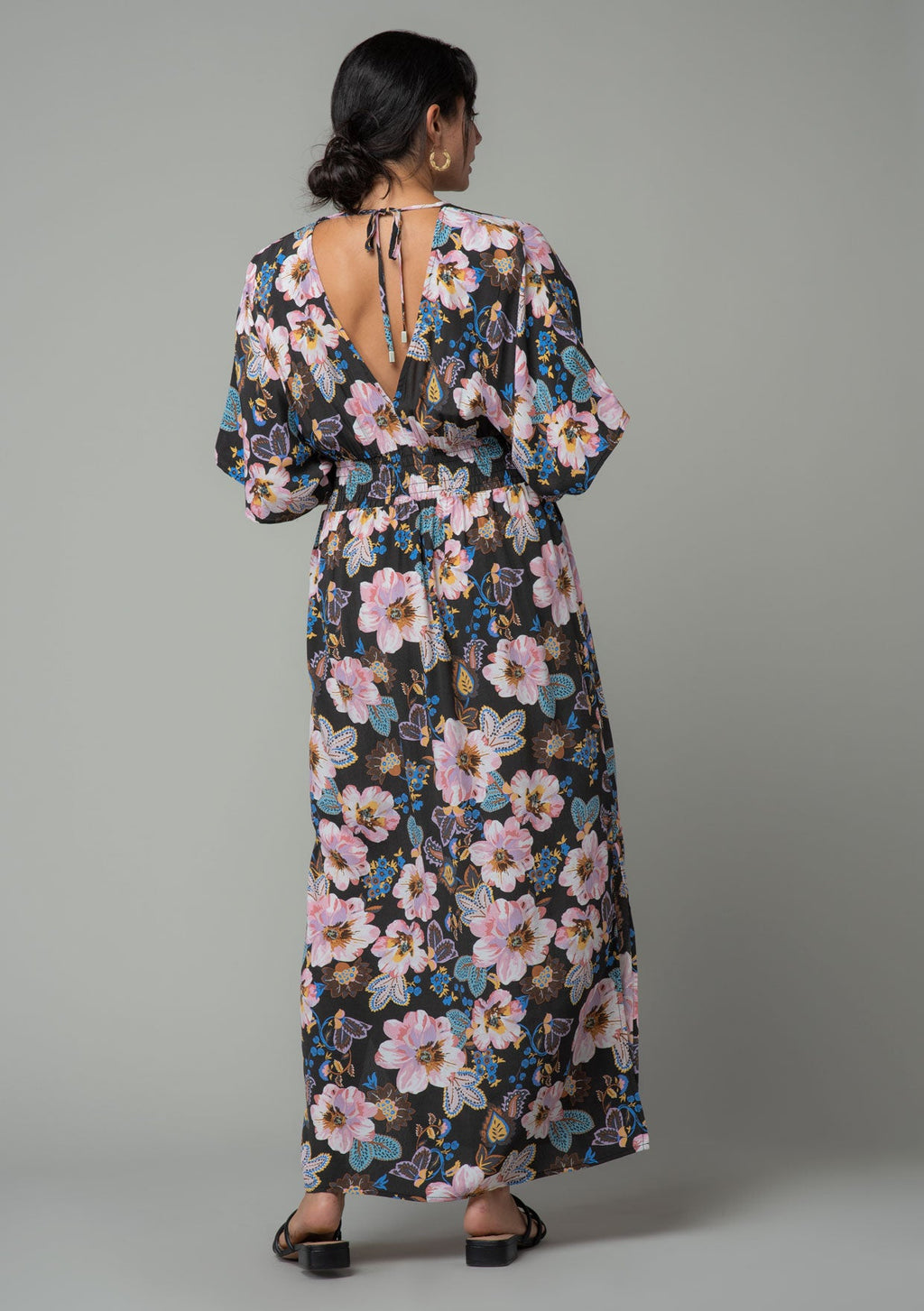 ![[Color: Charcoal/Rose] A close up back facing image of a brunette model wearing a charcoal grey and pink floral print bohemian resort maxi dress with half length kimono sleeves, an open back with tie closure, and a smocked elastic waist.](http://www.shoplovestitch.com/cdn/shop/products/I-73010W-RYF-AE-bold-floral-print-kimono-sleeve-maxi-dress-1_160x.jpg?v=1748481827)