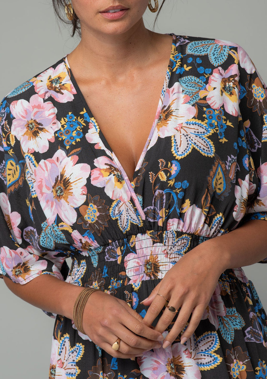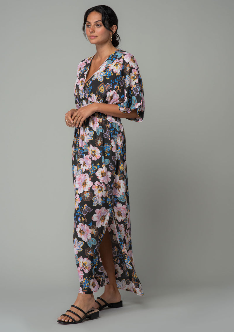 ![[Color: Charcoal/Rose] A close up front facing image of a brunette model wearing a charcoal grey and pink floral print bohemian resort maxi dress with half length kimono sleeves, an open back with tie closure, and a smocked elastic waist.](http://www.shoplovestitch.com/cdn/shop/products/I-73010W-RYF-AE-bold-floral-print-kimono-sleeve-maxi-dress_160x.jpg?v=1748481826)