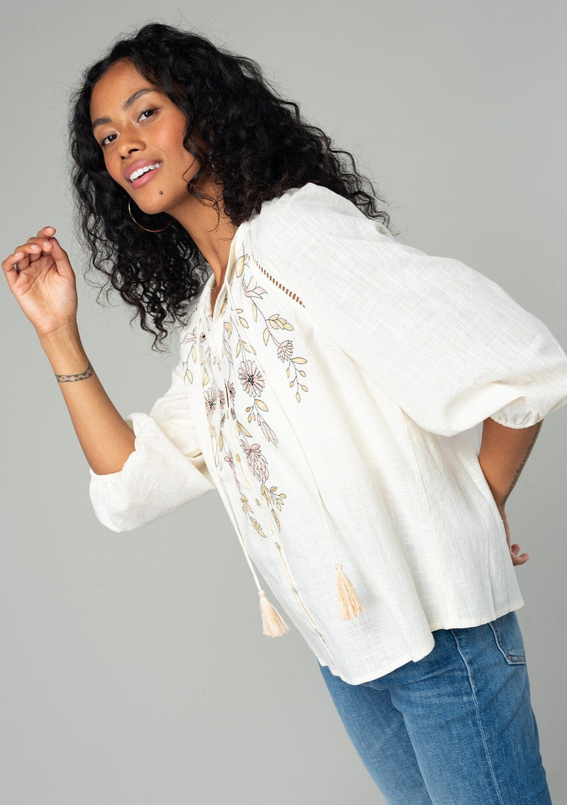 Ultra-bohemian embroidery adds a pretty touch to this classic spring blouse. With 3/4 length raglan sleeves, a split v-neckline with tassel ties, and a flowy, relaxed fit. We love to style this timeless top tucked into denim with a simple leather sandal.