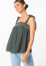 A timeless bohemian tank top, just in time for warmer weather. This effortless top is designed in ultra-flowy crinkle gauze and features a smocked straight neckline with contrast thread detail. The adjustable shoulder ties add a flirty touch.