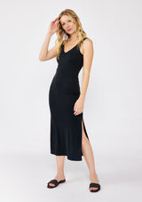 An everyday midi dress with a soft touch and slim-fit silhouette. The side slit adds a sexy twist to this classic piece and its flattering v-neckline gives a touch of casual elegance. Indulge in its soft and stretchy knit fabric—perfect for those with an on-the-go lifestyle.